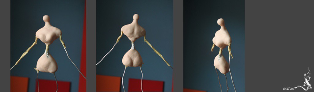 Соединяем все части куклы. Неровности шлифуем наждачной бумагой. Примеряем голову, подтачиваем, если нужно. Подрезаем и подгоняем. Затем склеиваем и шлифуем шов. Приклеиваем руки и ноги к туловищу. Талию и проволочную часть обматываем поролоном и нитками.