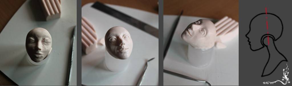 Слепить голову вам поможет наш мастер-класс Лепка головы куклы. После того как вылепили, разрезаем лезвием линию головы. Линия проходит от шеи до верха головы. Вынимаем кусочки пластики в том месте, где шея соединяется с головой. Голова должна вращаться свободно.