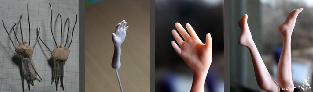 Лепим руки. Для рук делаем каркас из более тонкой проволоки. Скрепляем липкой лентой проволоку и сгибаем пальцы. Облепите руки куклы глиной. Почти так же формируем и лепим ноги. Запекаем полученные заготовки в духовке.