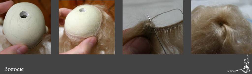 Или покупаем готовый парик, или приклеиваем волосы сами. Лучше всего для этой цели подходит мохер. Если его нет, берём искусственные волосы. На макушке головы куклы сверлим дыру, карандашом рисуем на голове спираль (как волосы растут). Клеим по нарисованным линиям волосы. В конце мажем клеем пучок волос и вставляем в дырку на голове. Рисуем акриловой краской глаза. Розовой краской наносим румяна. На веки и губы наносим лак для ногтей. Рисуем кистью брови и ресницы. Принцесса готова.