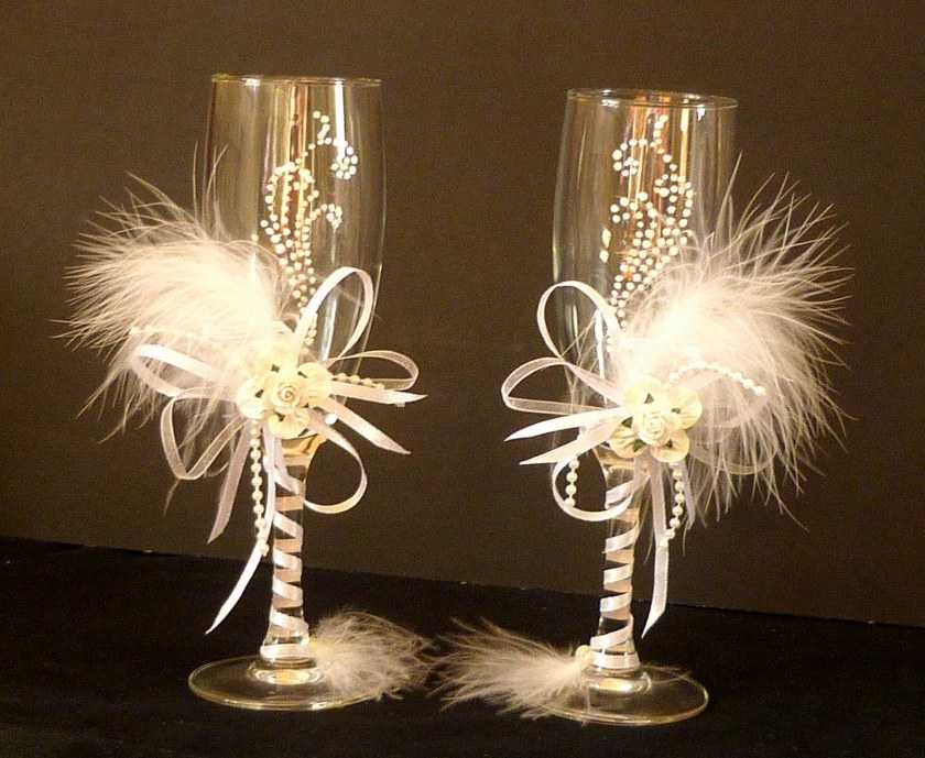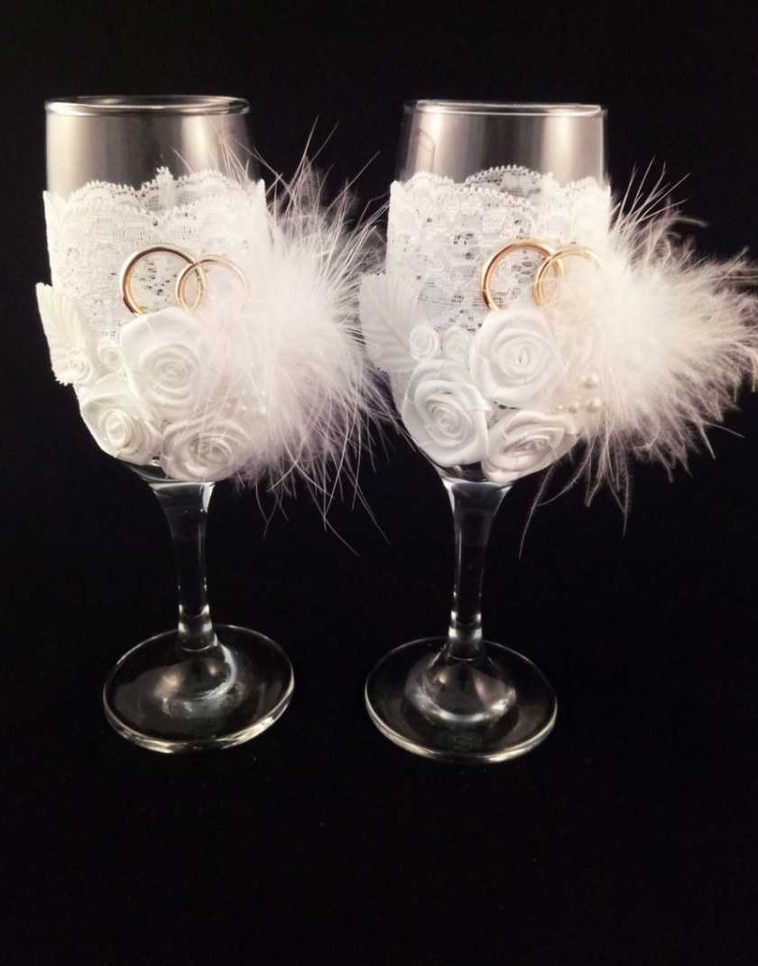 Важно приклеивать их непосредственно у основания, чтобы во время торжества бокалы на свадьбу своими руками выполняли свои функции, а украшения не мешали