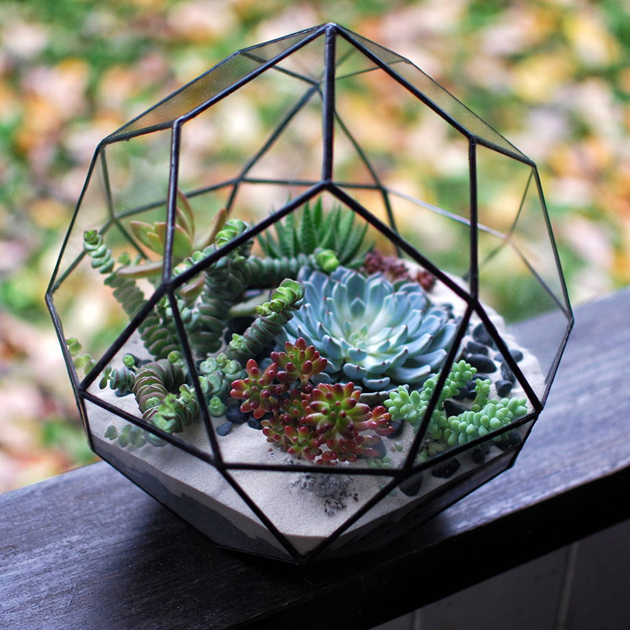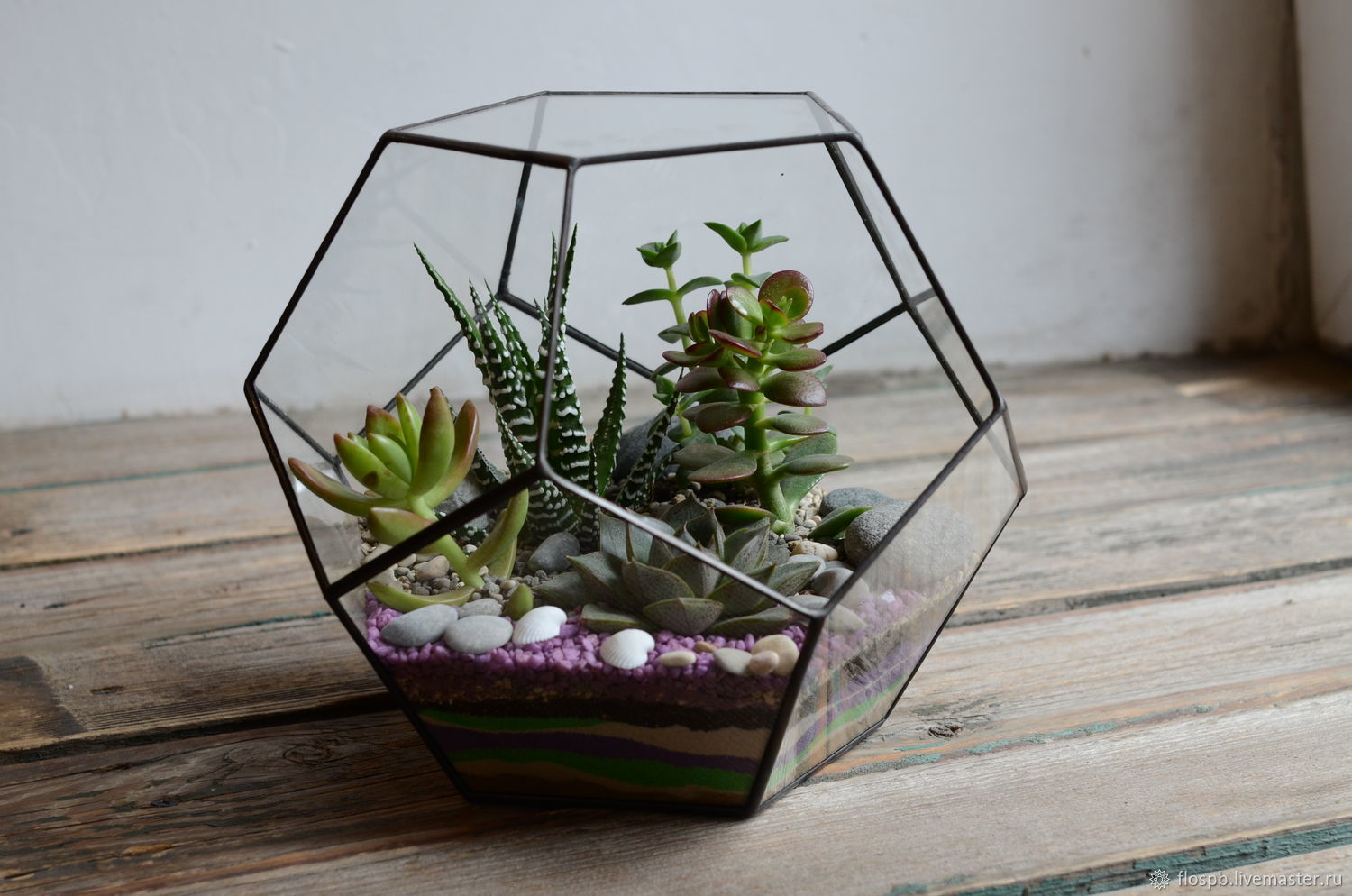 - Многогранные. Флорариумам придают разные причудливые формы с множеством граней, что наделяет их особым шармом. Это могут быть готовые фигурные вазы или самодельные конструкции. Их заполняют самыми необычными экзотическими растениями.