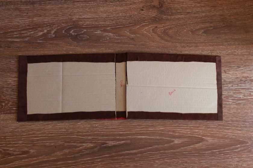 - Выложите две корочки на ткань так, чтобы осталось место для корешка, примерно, 2 см. Приклейте ткань, а затем прострочите.