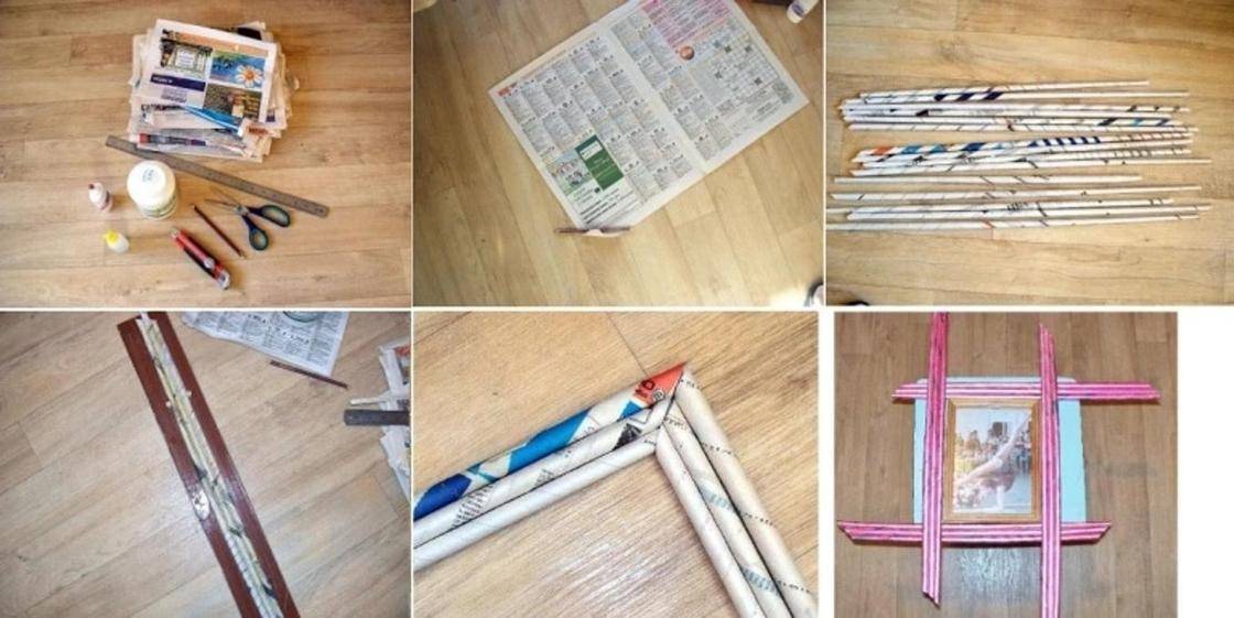 В любом доме наверняка имеются оставшиеся после ремонта обои или старые газеты и журналы. Умельцы, владеющие техникой оригами, могут изготовить из них замысловатые, собранные из нескольких секций рамочки для снимков. Также можно изготовить фоторамку с жестким каркасом их газетных трубочек. Они переплетаются между собой различными способами и раскрашиваются.