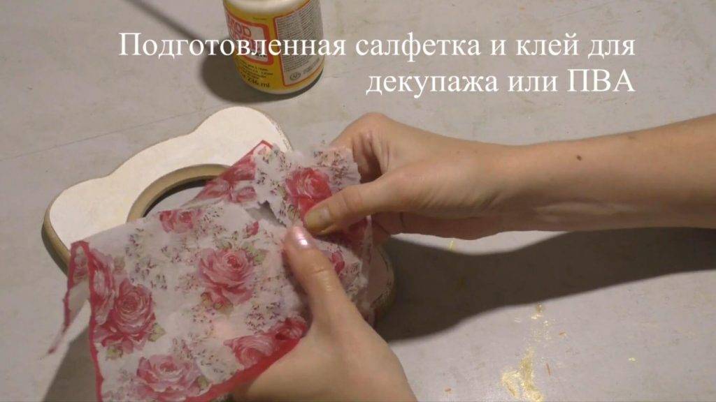 - С салфетками. Если применяются специальные салфеточки, нужные именно для декупажа, то их нужно расслоить, убирая верхнюю часть, если применяются простые аналоги, их на слои не разделяем, а приклеиваем как есть.