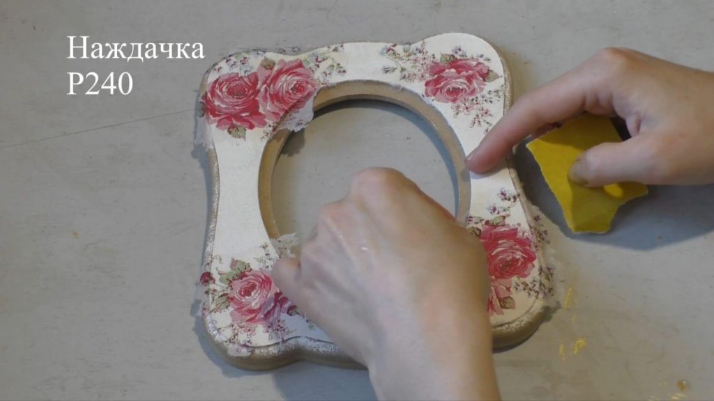 Мелкой наждачной бумагой ошкуриваем всю поверхность рамки, включая боковую поверхность.