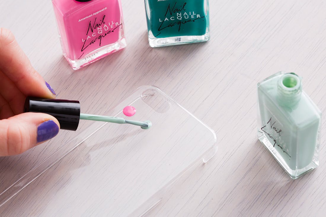 Лаком покрывается задняя стенка смартфона, кисточкой очень быстро наносятся блёстки и закрепляются основой. После высыхания он готов к использованию.