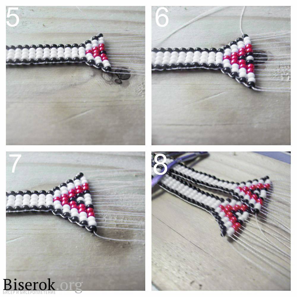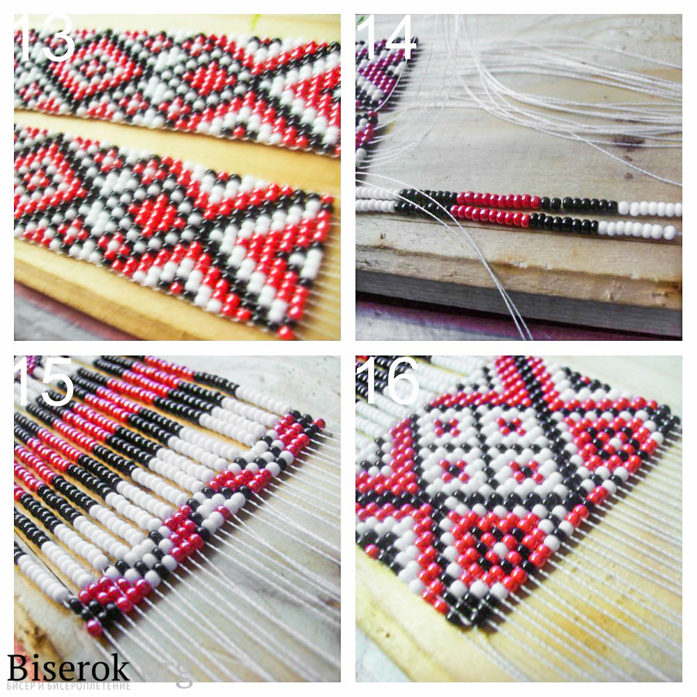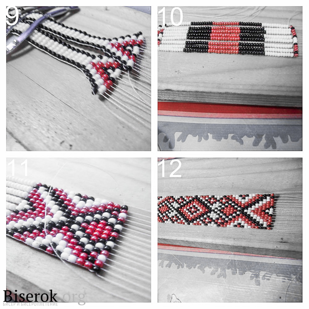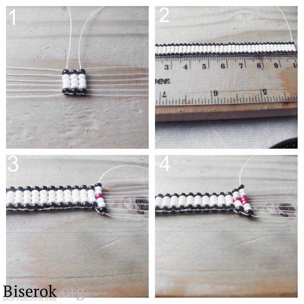 Этим методом проплетаем в одну сторону десять сантиметров. Далее проходим иголкой с нитью через самый конечный ряд зауженной ленты, потом отрезаем и фиксируем к станку с двух сторон. Затем на рабочую нитку продеваем одну черную, две белых, одну красную, две белых, одну черную бисеринку и аккуратно продеваем рабочую нитку под нитями основы и проходим сверху.
