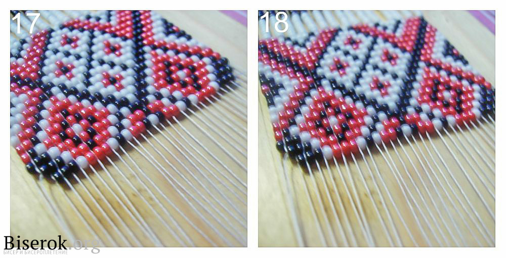 Таким методом мы продолжаем ткать и пропускать по одной до самого конца до тех пор, пока не доберемся до первого элемента бисера. После окончания ткачества фиксируем рабочую нитку в бисере и убираем будущий гердан со станка.