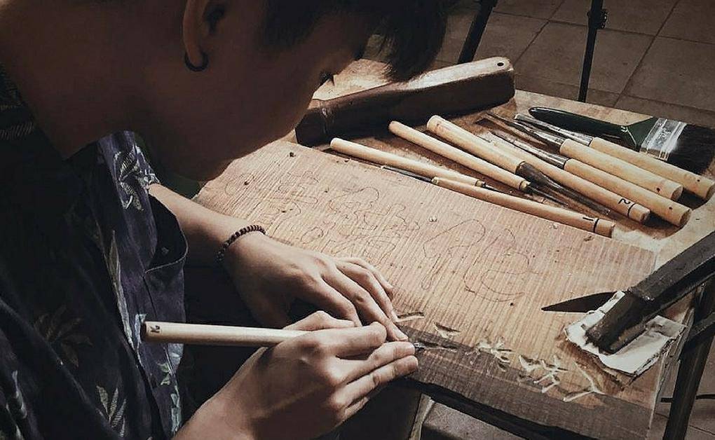 - Используя ножи и стамески, он вырезает небольшие углубления по нарисованным контурам.