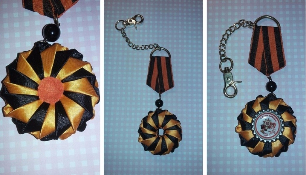 Научившись собирать подобный цветок, вы сможете сделать медаль-подвеску к Дню Победы: