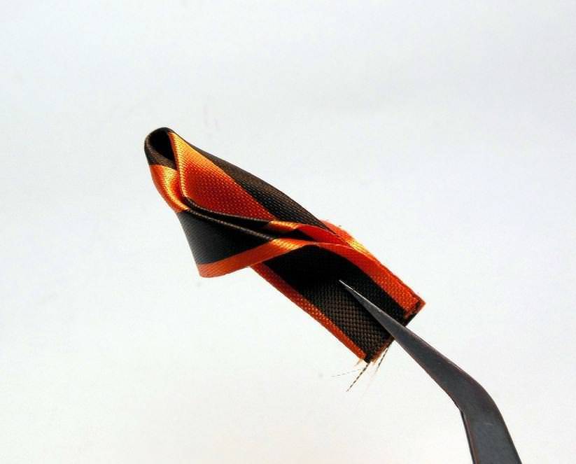 Чёрная и оранжевая ленточки нарезается в форме квадратики со сторонами 5 сантиметров. Таким способом подготавливаются семь элементов чёрного цвета и 14 оранжевого. Обязательно необходимо обработать срезы над огнём, чтобы предотвратить осыпание.