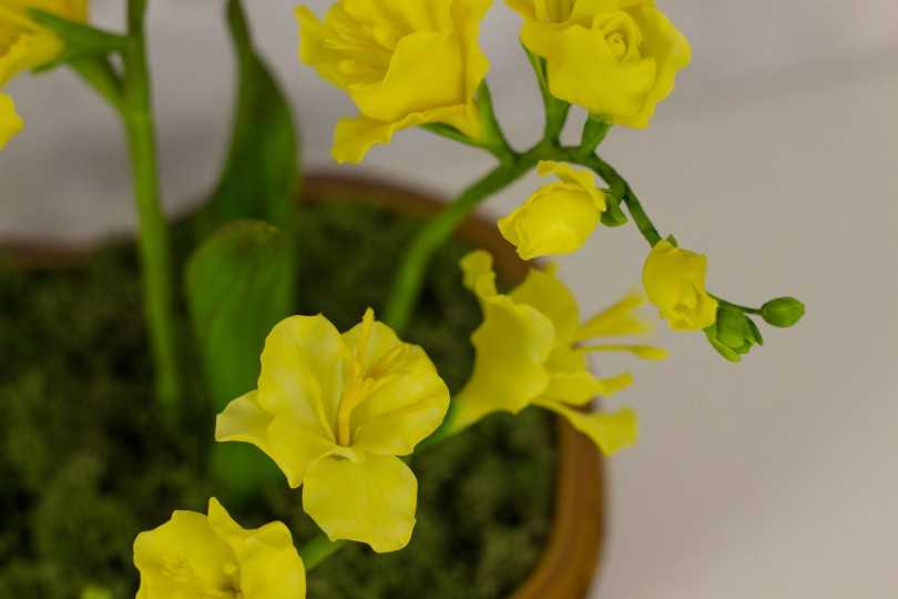 Запекание обязательно проводится в духовке. Печи СВЧ не используются. В чем смысл процедуры? Цветы из пластика не ломаются и не разбиваются. Если кто-то уронил или задел композицию, она легко восстанавливается.
