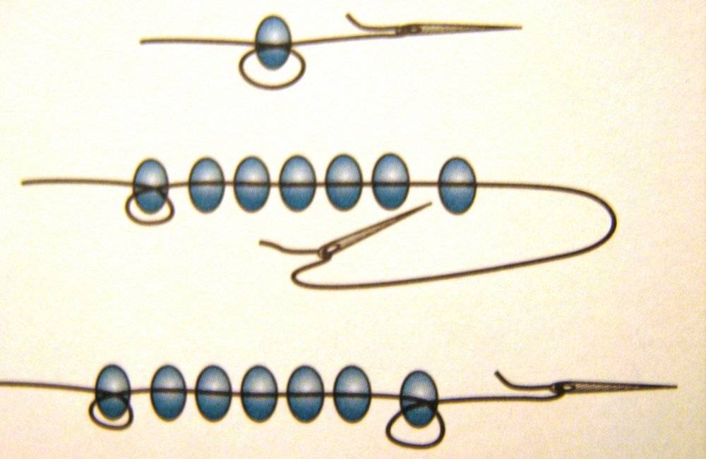 Иголка продевается в распределенный ряд бисера и проходит над основными нитями. При вытягивании иглы нить немного натягивается.