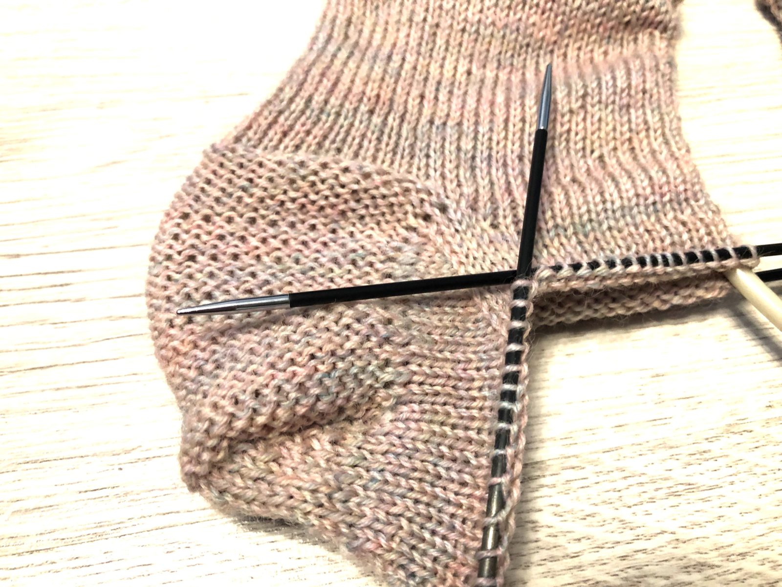 Вязание высоты пятки для правого носка начинаем с лицевой стороны. Для левого — с изнаночной.