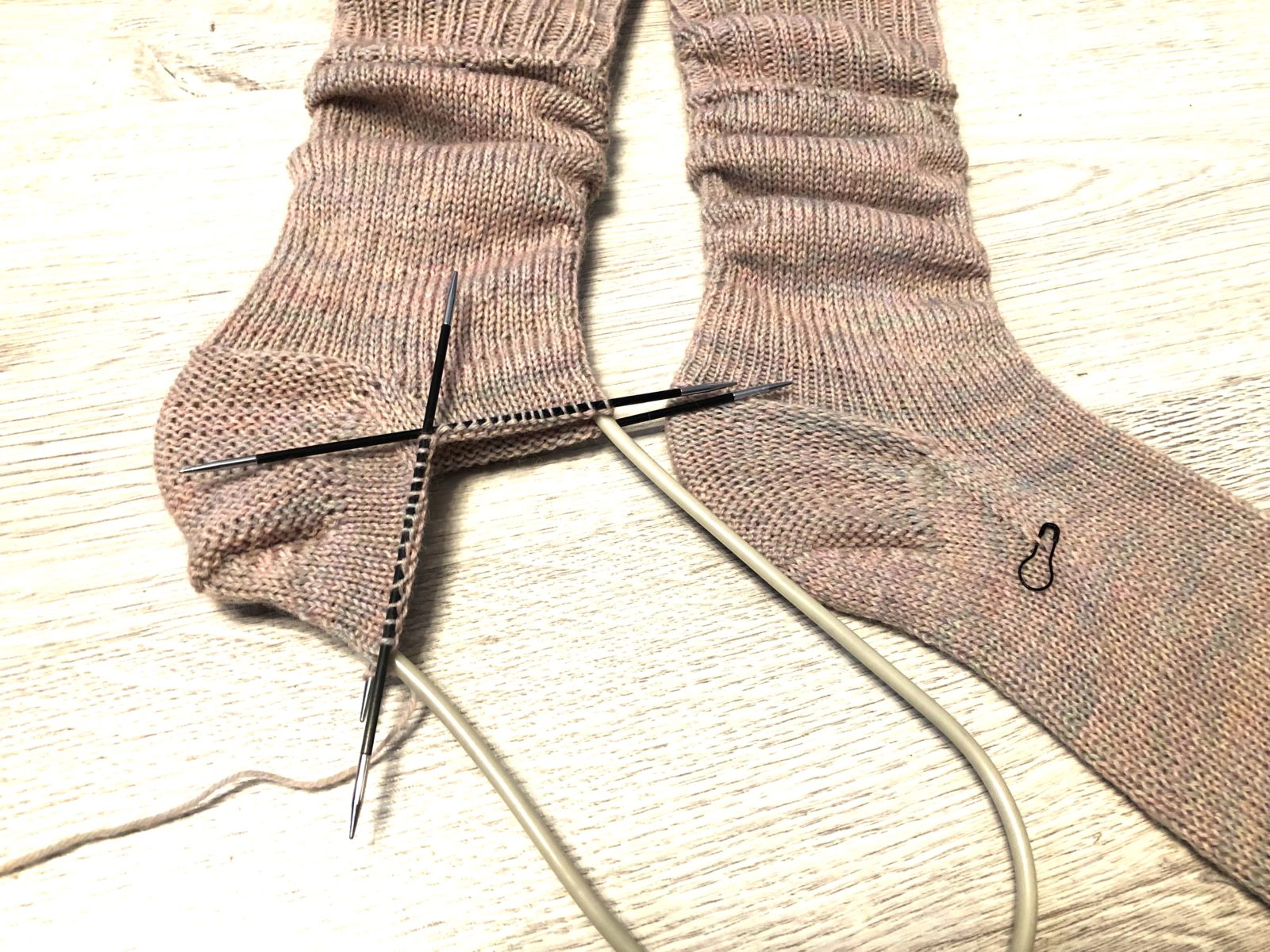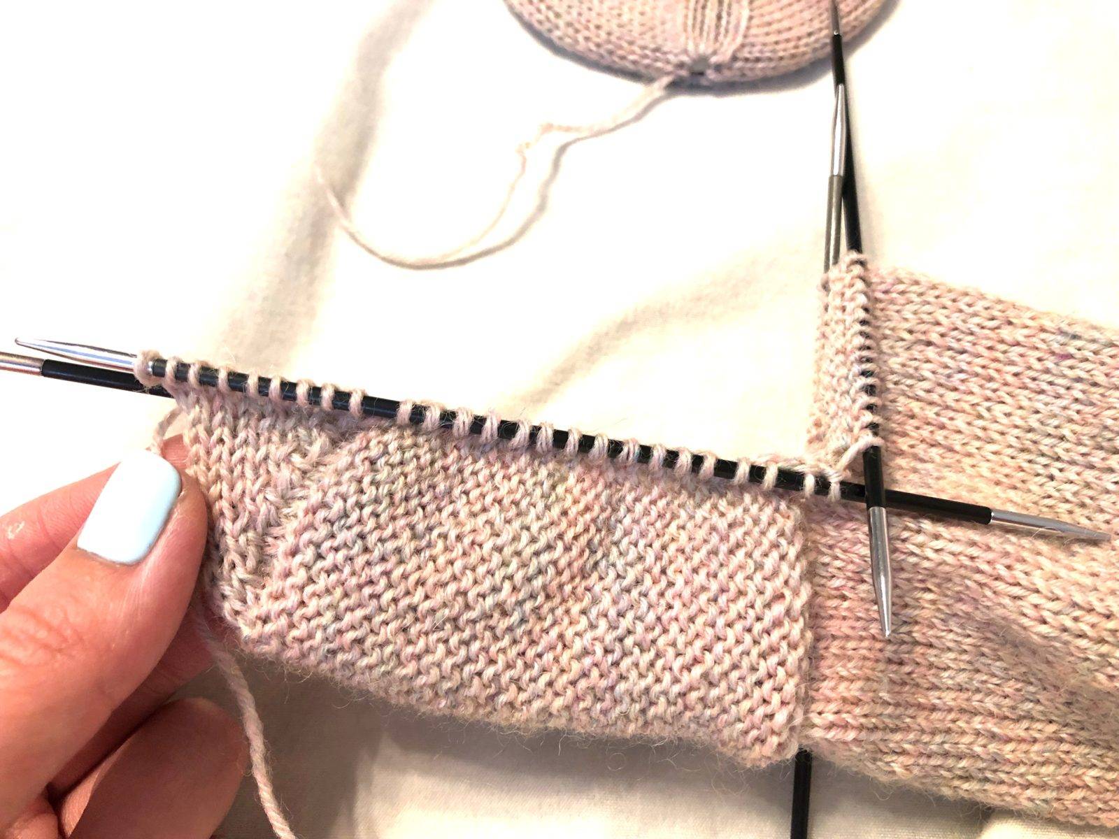 Пятка вяжется на двух нижних спицах. Чтобы определить, какие спицы являются нижними, нужно, чтобы кончик от набора петель смотрел внутрь ноги. Таким образом, для левого гольфа кончик будет справа, а для правого — слева. После окончания вязания мы будем прятать кончики с помощью крючка на изнаночную сторону гольфа. Чтобы их было не видно, оставляем кончики с внутренней стороны.
