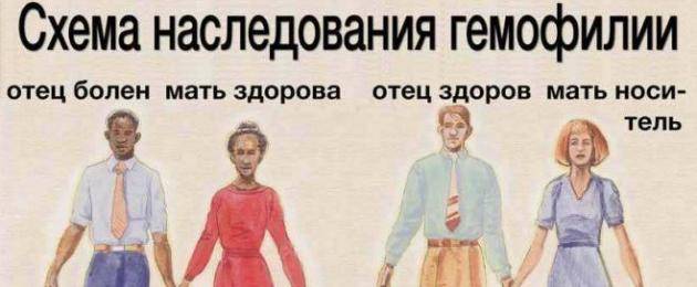 Значительную помощь в диагностике гемофилии оказывает выявление характера наследования. Наличие сцепленного с полом геморрагического диатеза является убедительным доказательством наличия в семье гемофилии. Этот тип наследования характерен как для гемофилии А, так и для гемофилии В (дефицит фактора IX), которые могут быть дифференцированы ли с помощью лабораторного исследования.