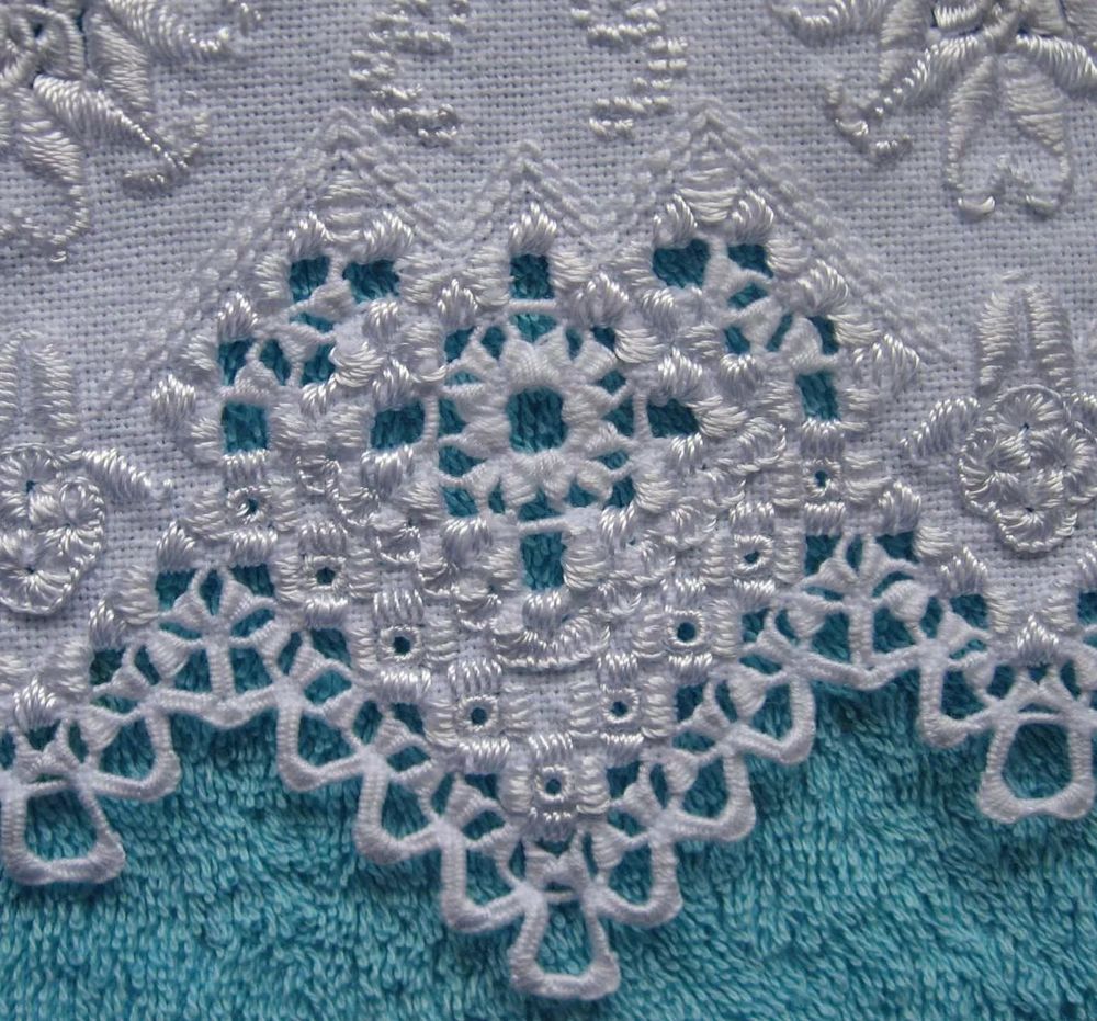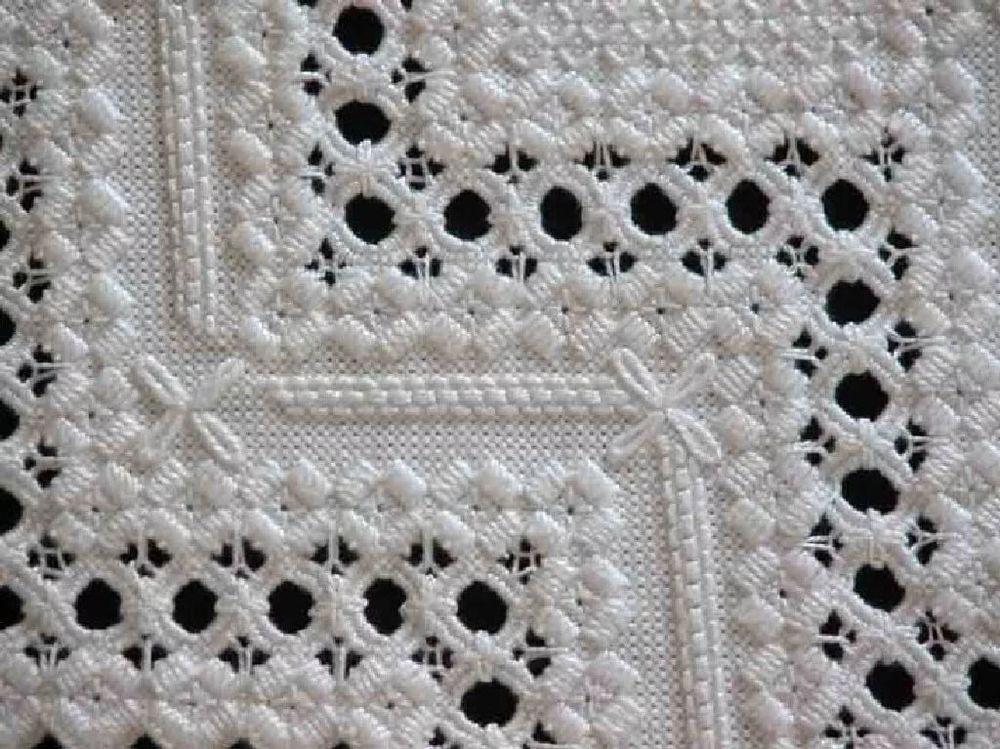 С помощью стежков создаются ажурные узоры, характерные для вышивки хардангер и производится обработка кромочных рядов.