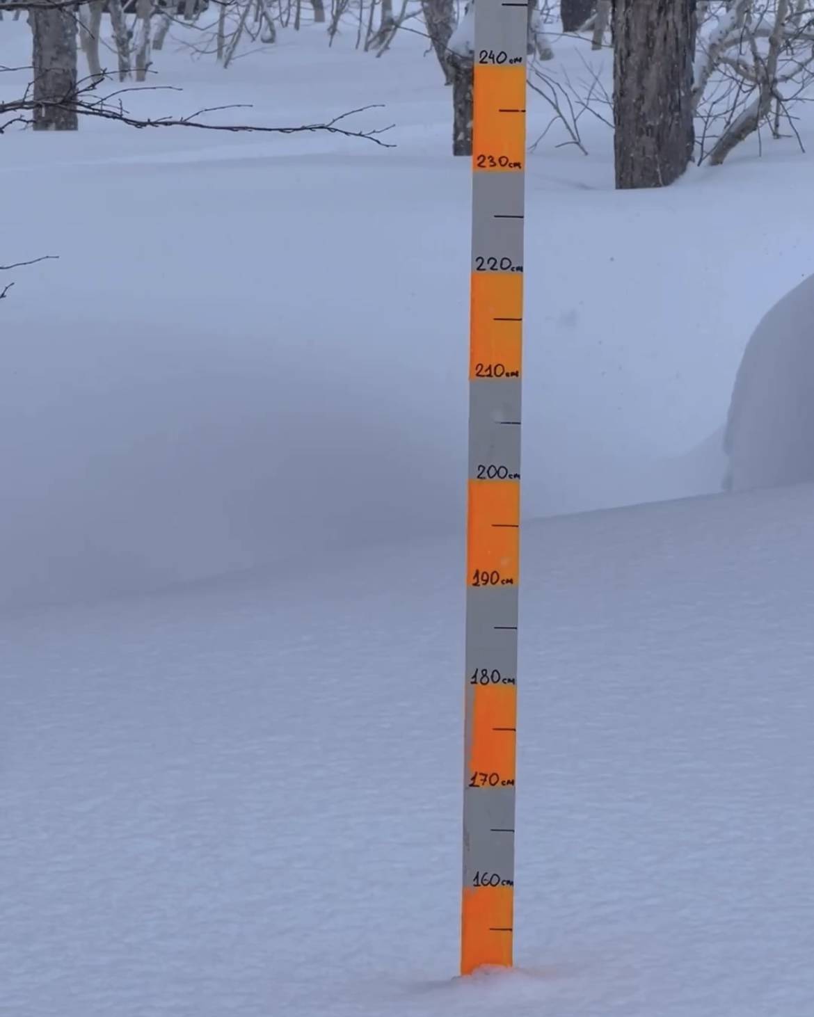 За нее отвечают основная рейка HS (High Snow), по которой замеряют общий показатель снега на базе. На время съемки среднее количество снега было 133 см. Понятно, что этот показатель в разных частях базы будет разниться, но средний показатель измеряется именно так, как мы описали выше.