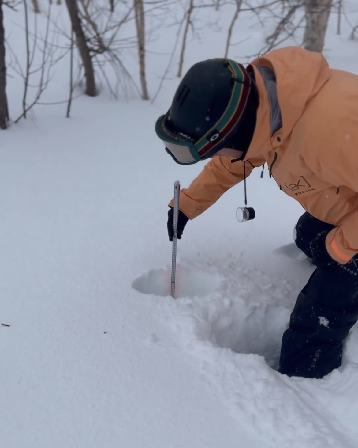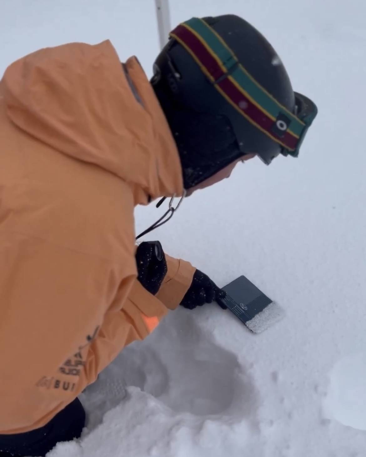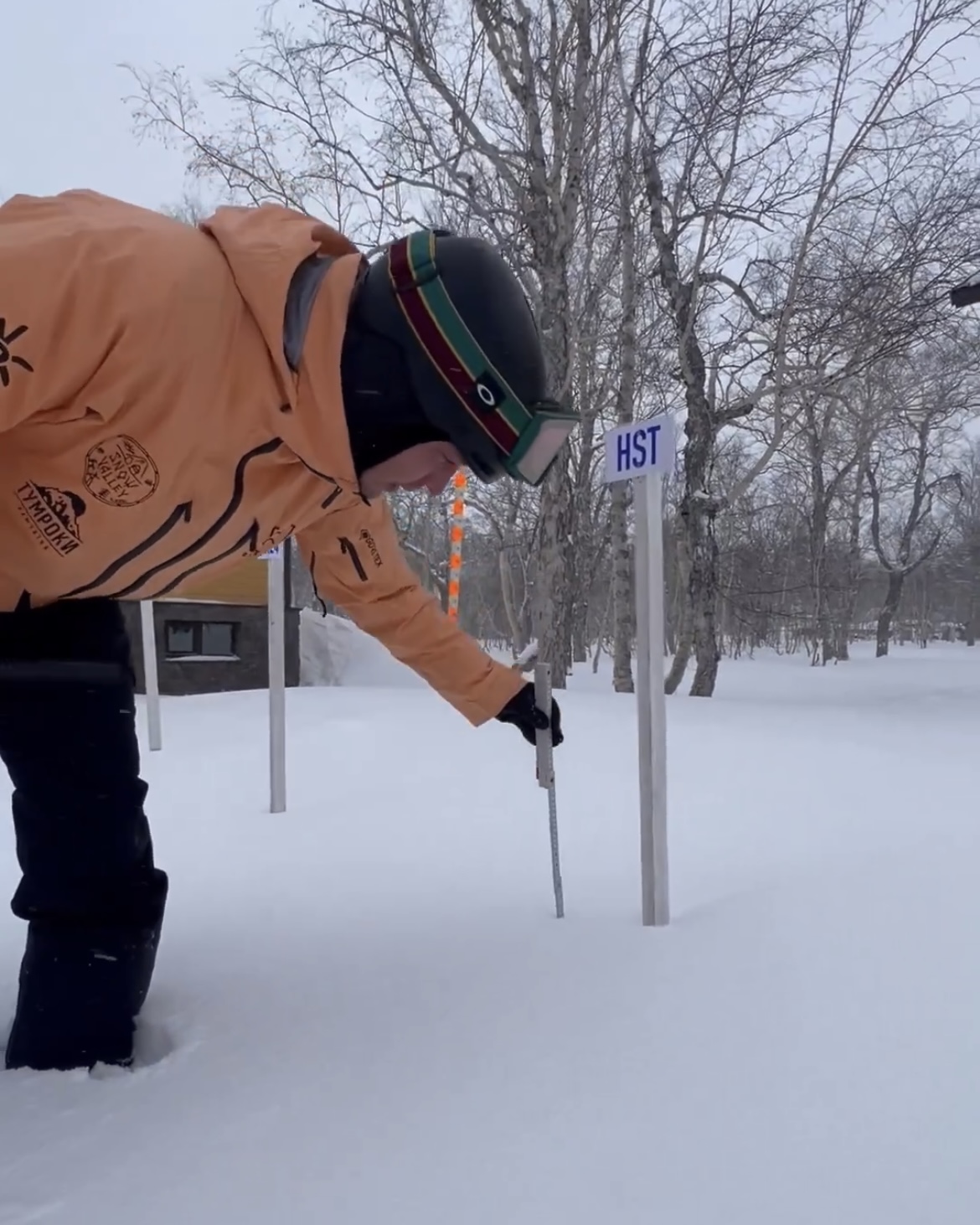 Механика измерений называется foot penetration. Так мы определяем, на какую глубину райдер будет погружаться, и как будет вести себя снег во время катания. Гид заходит в свежий снег, где он изначально ложился на землю. Одной ногой всем весом встает и прыгает. Достает линейку и меряет в середине следа глубину. На момент съемок она была 49 см.