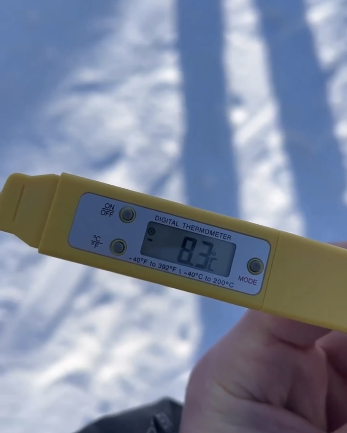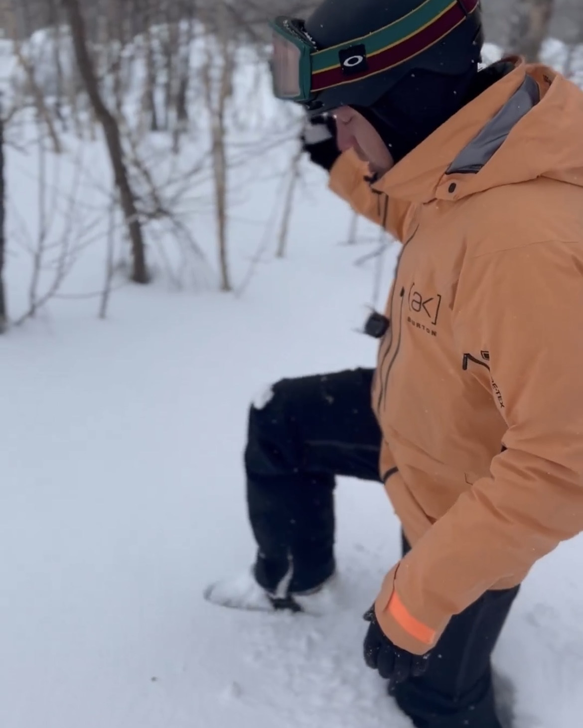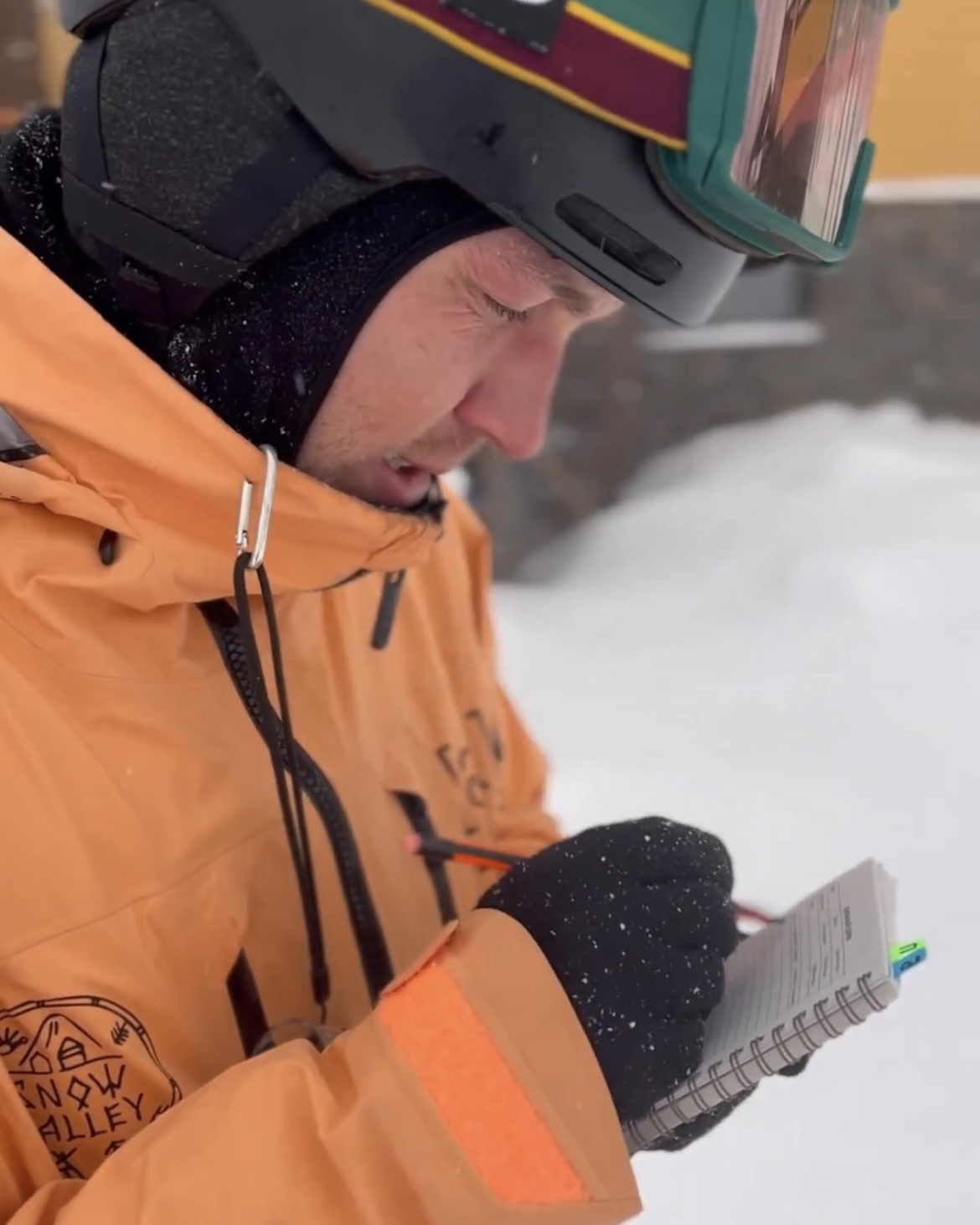 Механика измерений называется foot penetration. Так мы определяем, на какую глубину райдер будет погружаться, и как будет вести себя снег во время катания. Гид заходит в свежий снег, где он изначально ложился на землю. Одной ногой всем весом встает и прыгает. Достает линейку и меряет в середине следа глубину. На момент съемок она была 49 см.