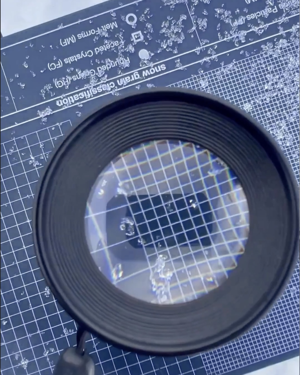 Аккуратно снимаем с поверхности сугроба снег. Под лупой изучаем размеры и виды снежных кристаллов. Начинаем читать снег, как книгу и понимаем, как формируется снежная толща. В данном случае нас интересует именно поверхность снега, где видны ровные свежие снежинки и плотные шарики, как крупа, похожие на град. Сопоставляем данные о снеге с полевыми наблюдениями, с ежедневными наблюдениями и делаем прогнозы на катание.