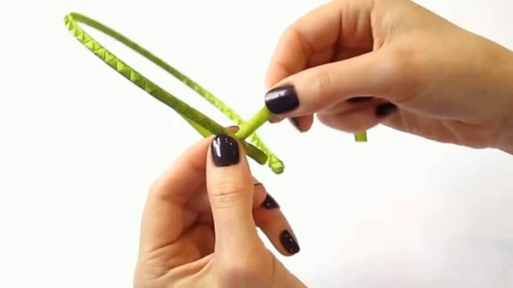 Затем снова: нижнюю ленту направили под верхнюю, а верхнюю отправляем за ободок, они опять должны соединиться. И так мы продолжаем наше плетение, натягивая ленты. Получается, что у нас эти 2 ленты попеременно находятся то на левой, то на правой стороне от ободка. Если вам непонятна схема плетения, можно посмотреть видео: ободок канзаши мастер класс — прилагается ниже фото.