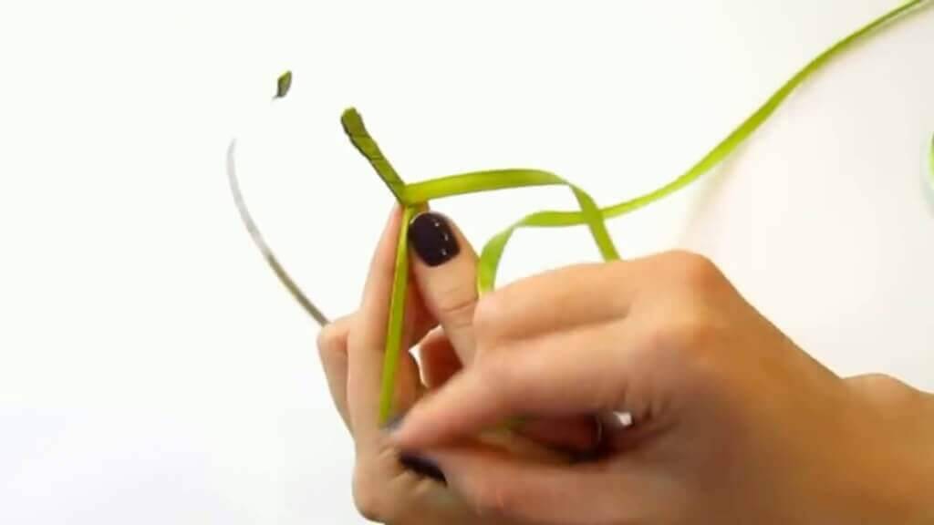 Для этого используйте обе узкие ленты. Опалите края зажигалкой, чтобы они не осыпались, и сделайте небольшую петельку в начале обеих ленточек. Закрепите клеем. Теперь проденьте одну петлю в другую (зеленая лента продета в желтую). На желтой снова сделайте петлю (клеем на этот раз ее закреплять не нужно) и проденьте в свободную петлю другого цвета.Затяните их и продолжайте продевать петли, чередуя цвета.