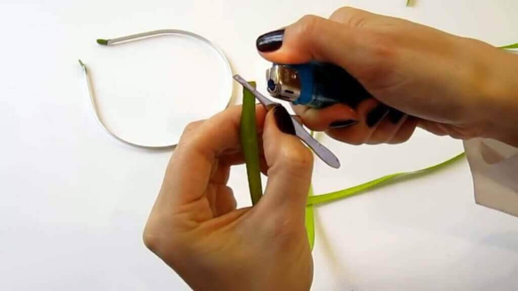 - Берем одну ленточку и сгибаем ее наружу лицевой стороной. Далее под углом срезаем кончик отрезка и подпаливаем при помощи зажигалки.