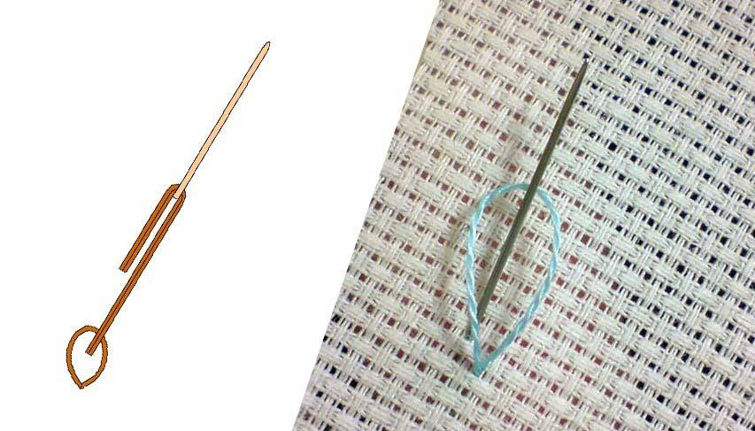 Считается самым быстрым и популярным приемом, но используется при вышивке крестиком четным количеством сложений. Существует два способа петли, когда вы фиксируете нитку на лицевой или нижней стороне канвы.