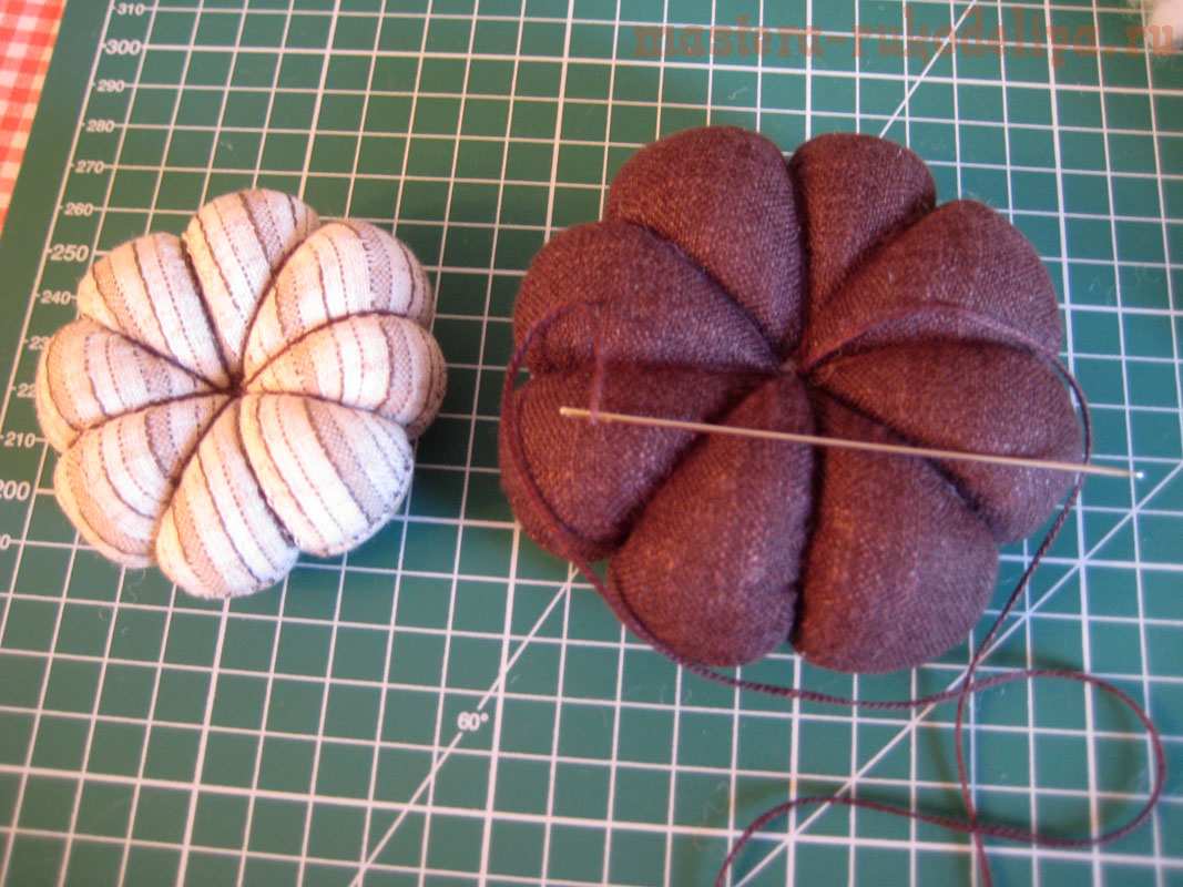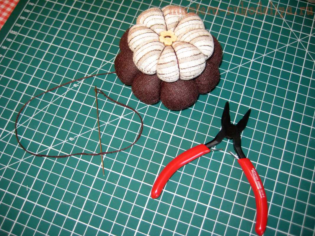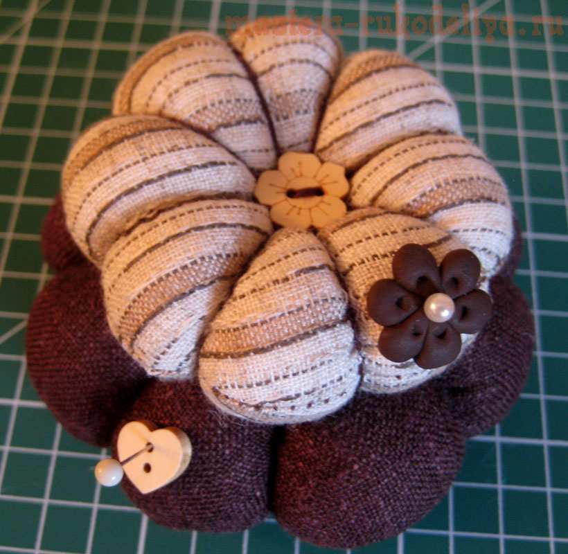 | Тыква | Создание игольницы в виде тыквы несложное. Она может быть круглая или овальная. В центре можно пришить пуговицу или сделать вышивку в виде листочка |