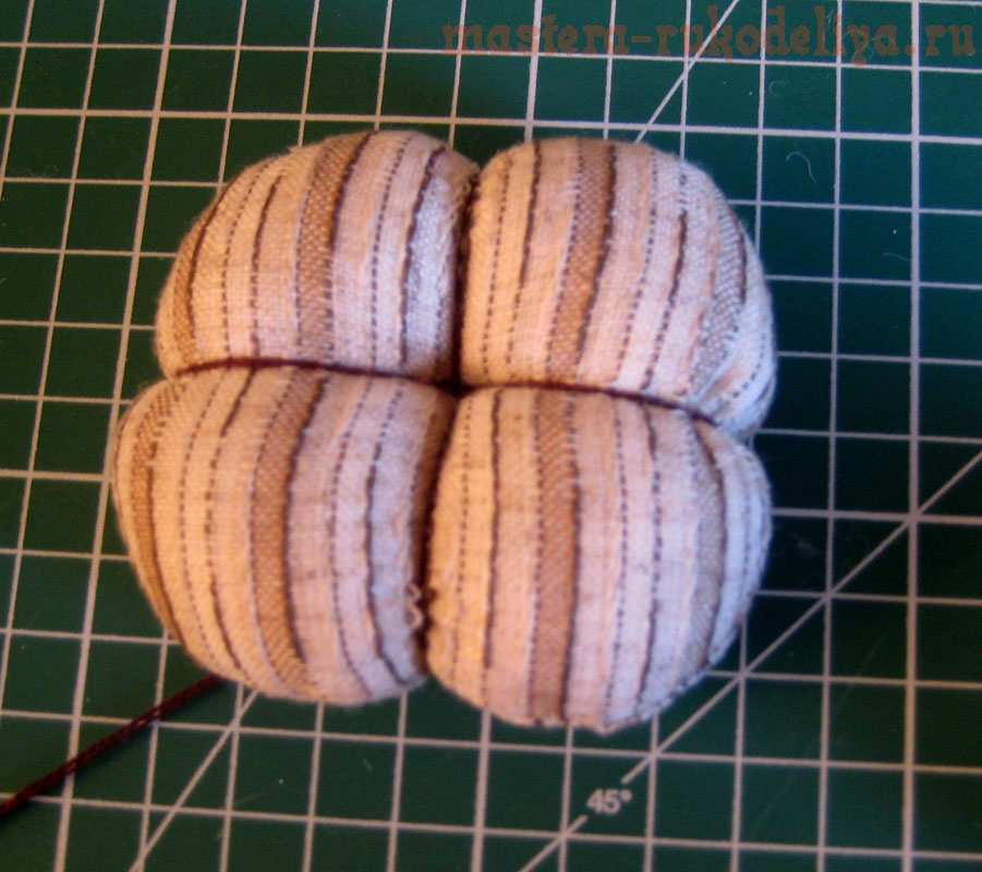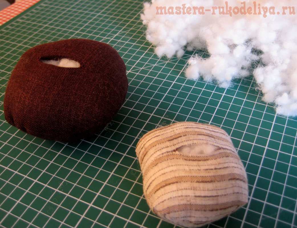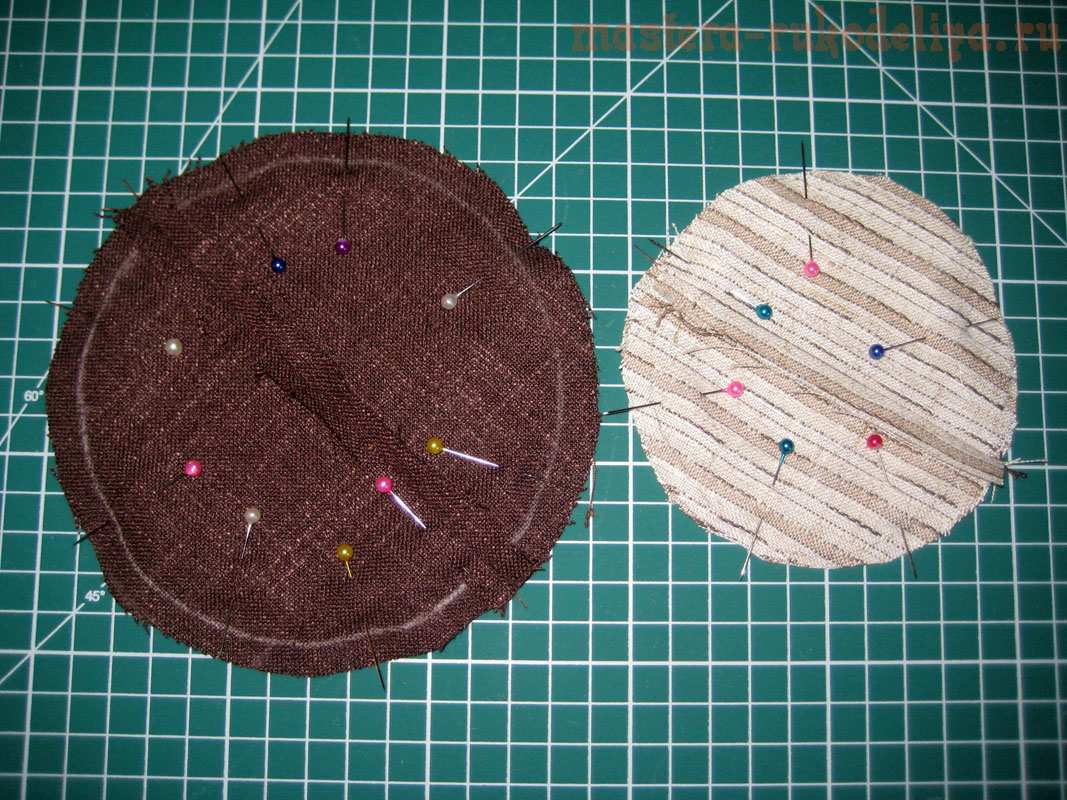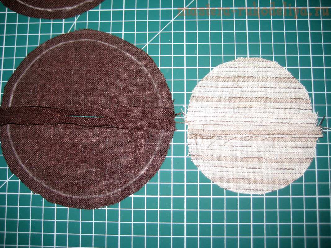 Чтобы не было перекоса во время набивки, при сшивании важно следить за направлением долевой нити. Из плотного картона вырезается дно и кусочек ткани, оставляется припуск шириной в 1 см. На груди ставятся метки — это поможет сохранить симметрию