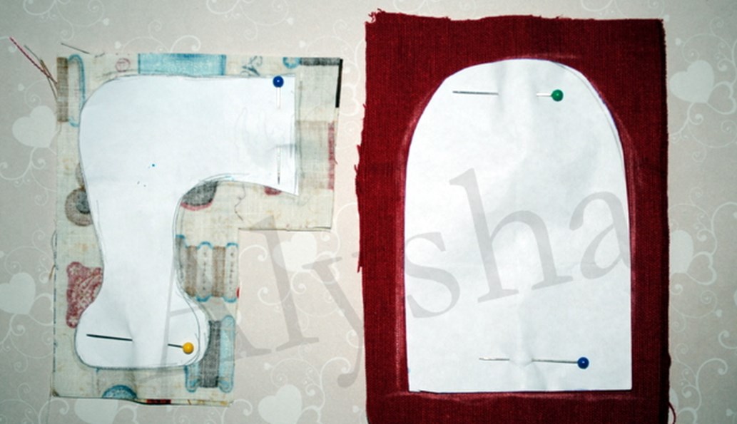 - К одной из выбранной ткани булавками прикрепляем шаблон, вырезаем 2 выкройки