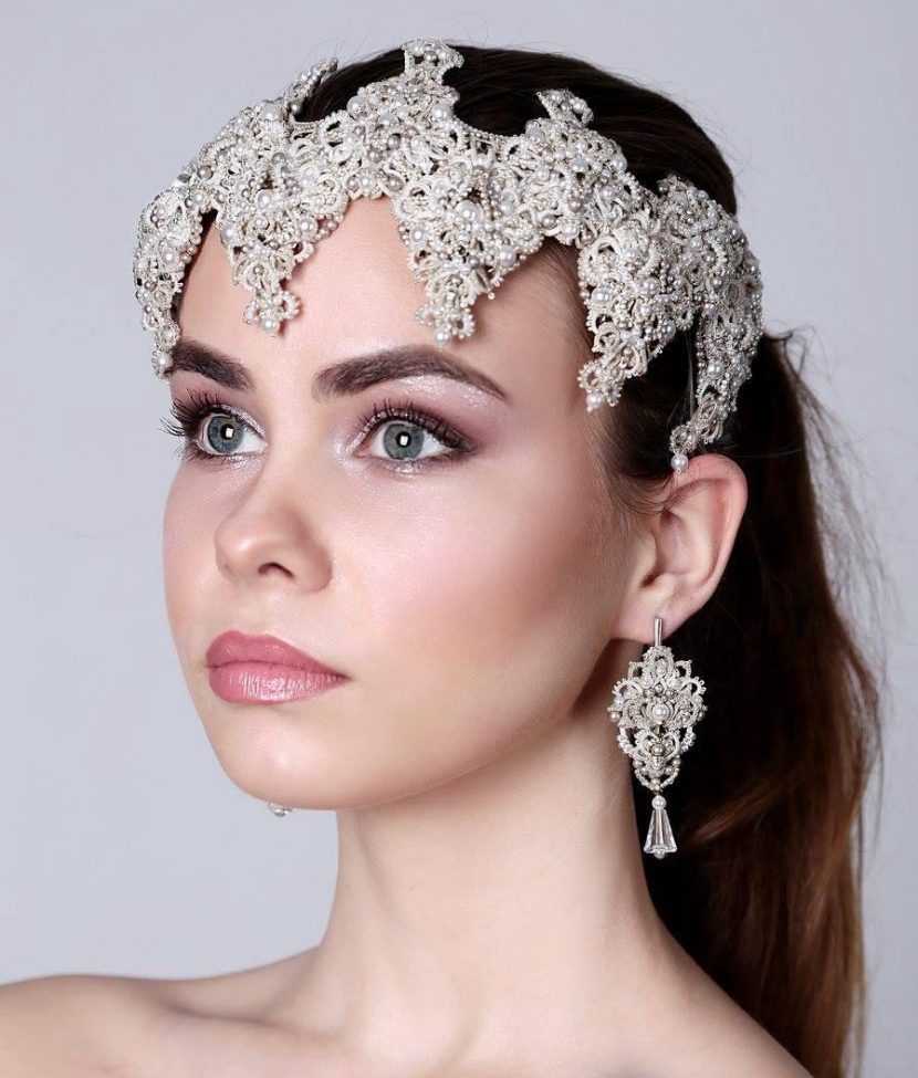 Свадебная корона украшена бисером и жемчугом Колье плетенное из капроновой нити с бисером