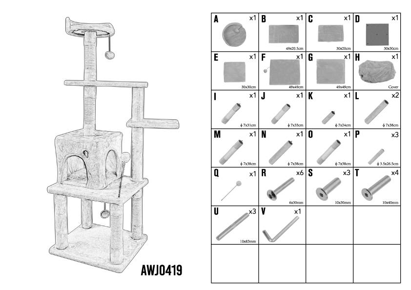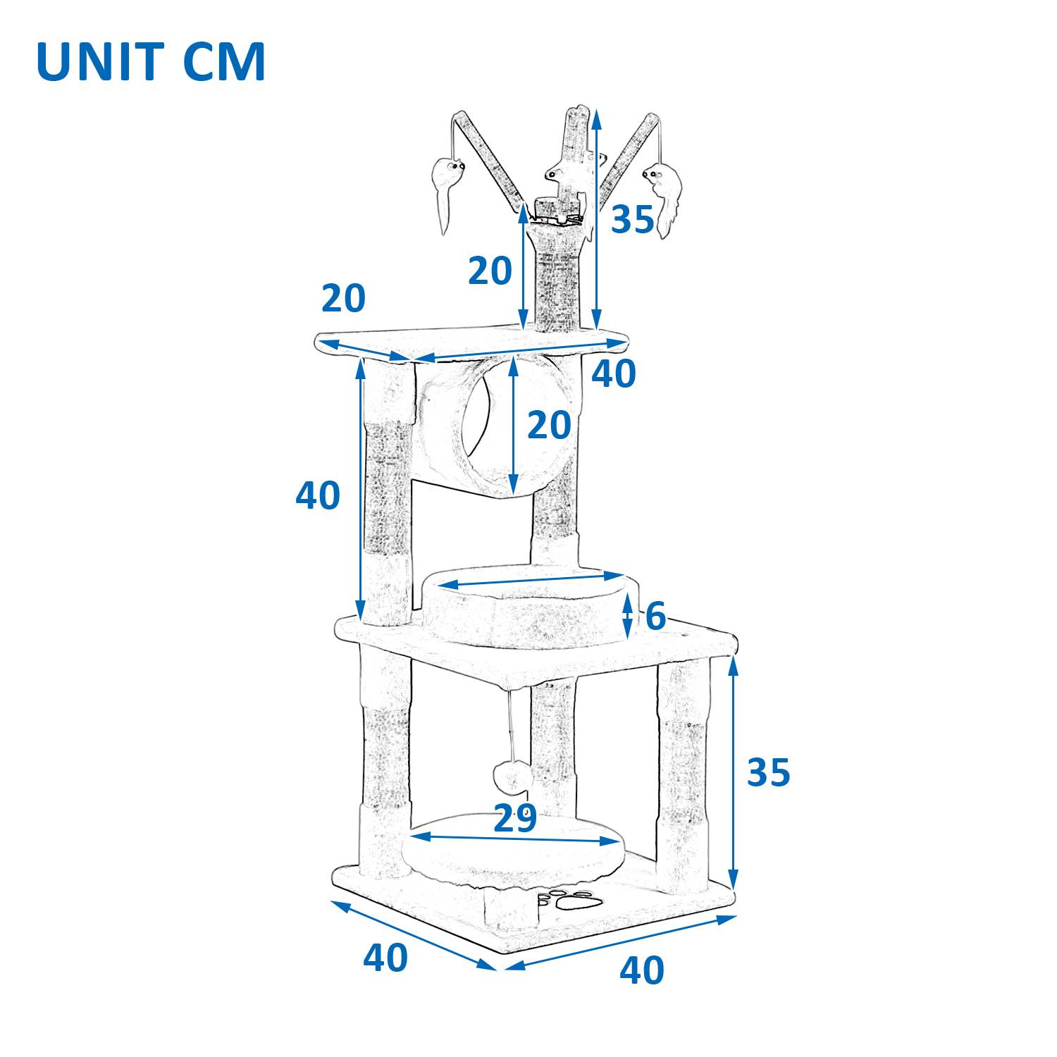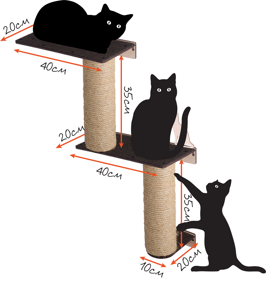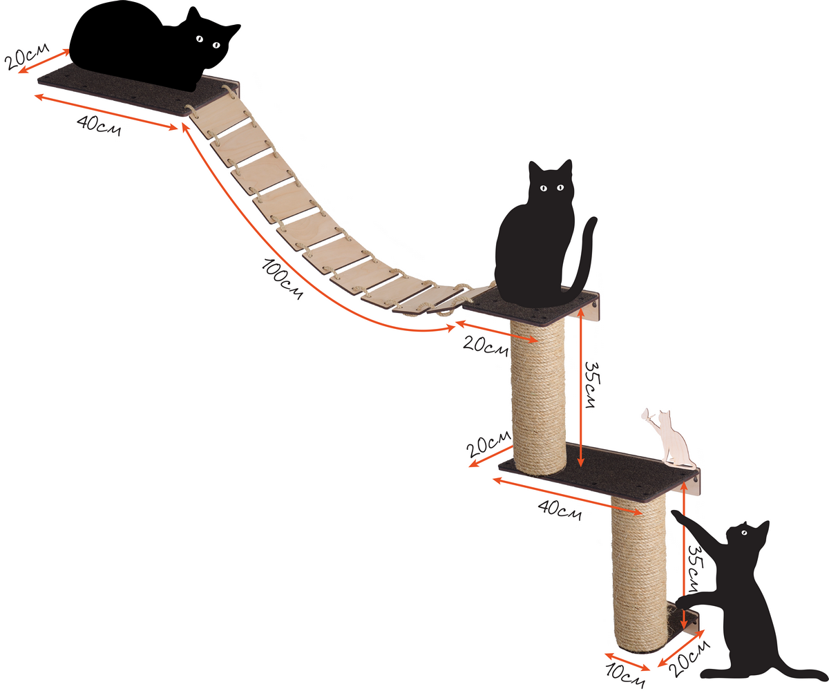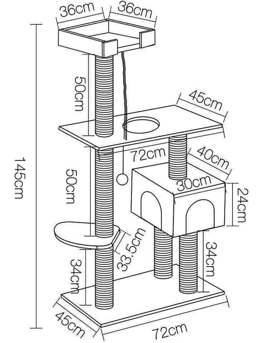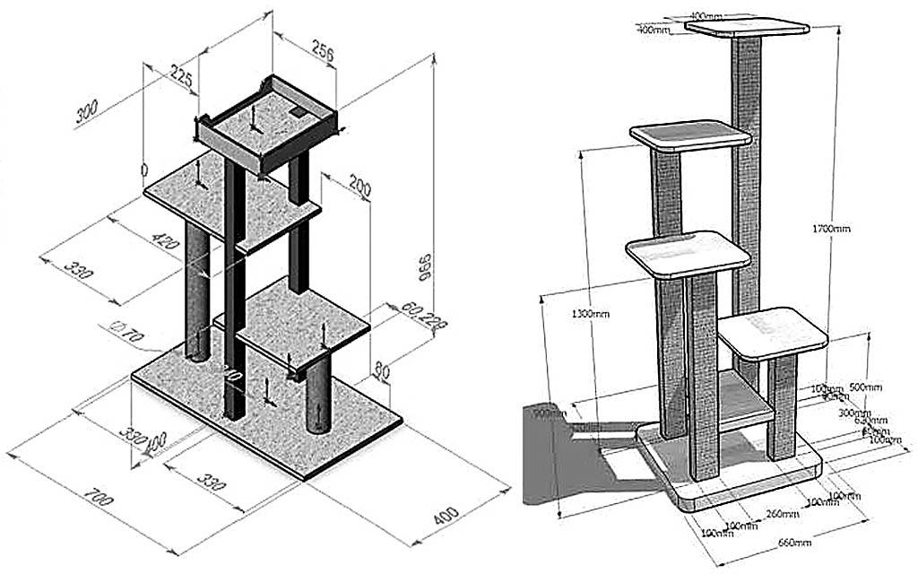 Перед тем как приступить, следует продумать конструкцию будущего изделия. Она должна быть устойчивой и безопасной для питомца. В качестве основы для комплекса используют три элемента, параметры которых изображены на схеме.