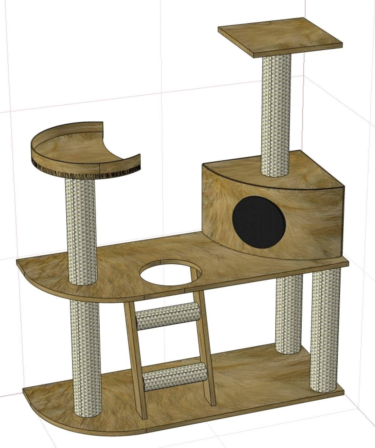 Материалы. Для основы принято брать листы ДСП, с ними удобно и легко работать, к тому же они стоят относительно дешево. Что касается отделки, то тут в ход может пойти все, что есть у вас дома: обрезки ковролина, различная ткань, джутовая или просто бельевая веревка. Старайтесь выбирать натуральные материалы, поскольку домашние питомцы склонны к аллергическим реакциям.