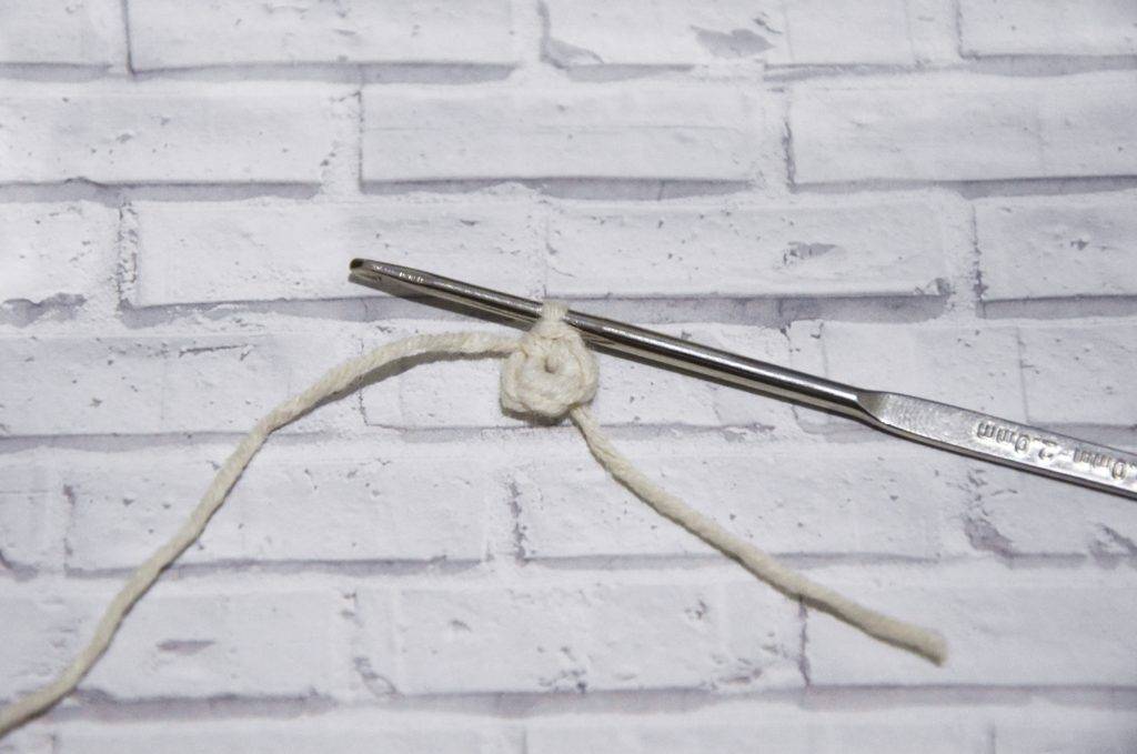 - Зацепите крючком нить для работы, и проденьте ее сквозь сформировавшуюся петлю. Вытащите нить, и затяните ее.