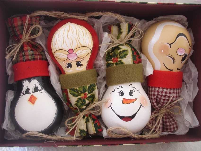Помимо сказочных персонажей, можно придумать множество других не менее интересных вариантов игрушек из лампочек. В зависимости от того что хорошо получается делать своими руками, можно изготавливать восхитительные елочные игрушки.