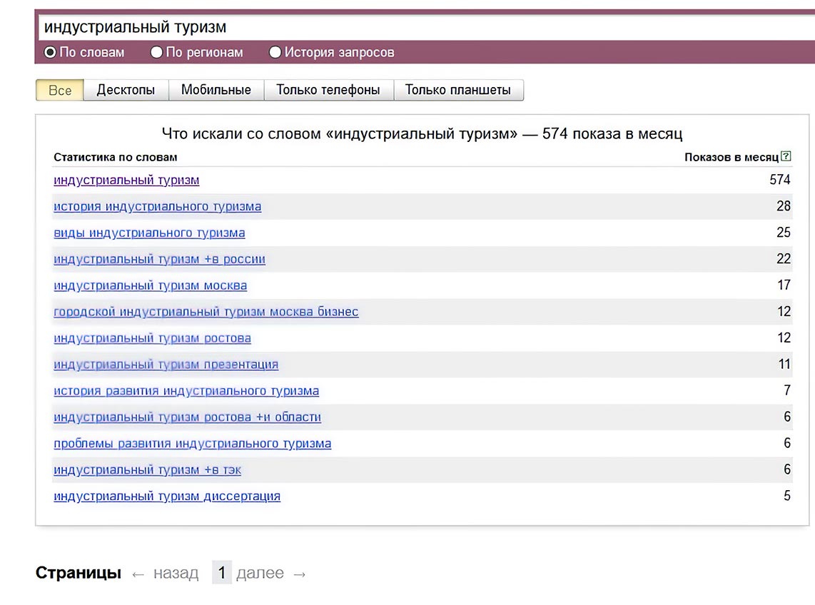 Среднее ежемесячное количество поисковых запросов в Яндексе со словосочетаниями «индустриальный туризм», «промышленный туризм», urbex и urban exploration в январе 2021 года — 2100. Количество в Google меньше и составляет от 300 до 1500 запросов в месяц.