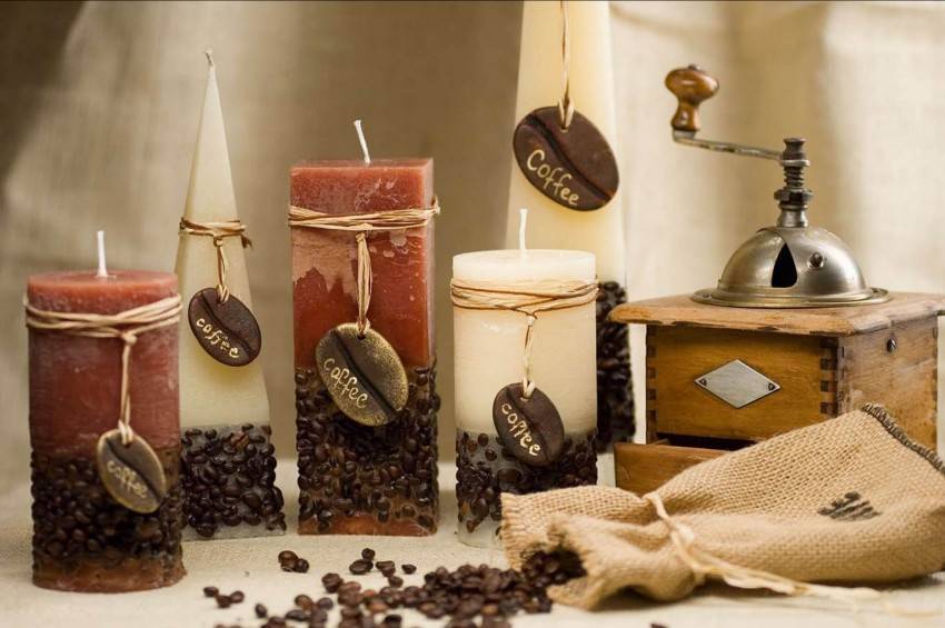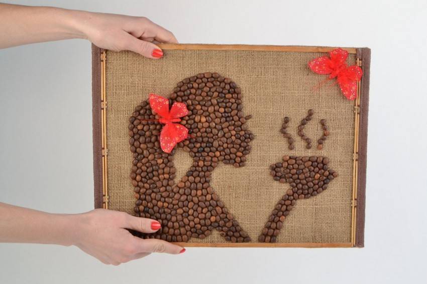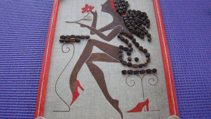 Зерна кофе можно использовать для создания красивых картин. Это еще проще, чем склеивание топиарий, но внешний вид ничуть не уступает по своему неповторимому стилю. Такая кофейная поделка может быть на деревянном основании или на картоне.