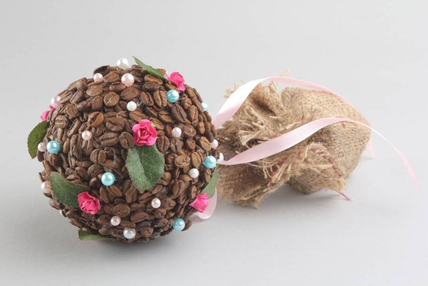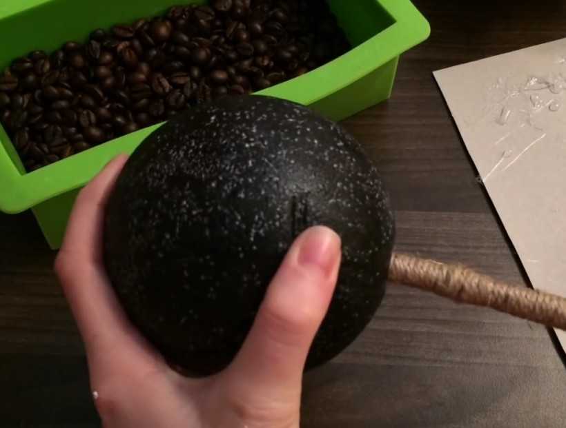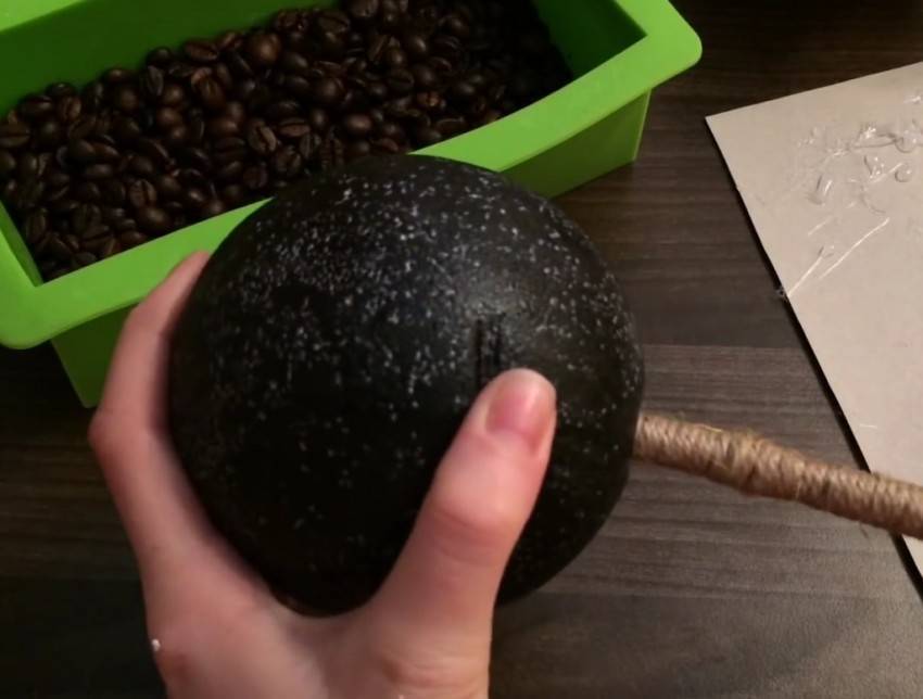 Следующим этапом является приклеивание кофейных зерен по всему периметру шара, промазанному клеем ПВА