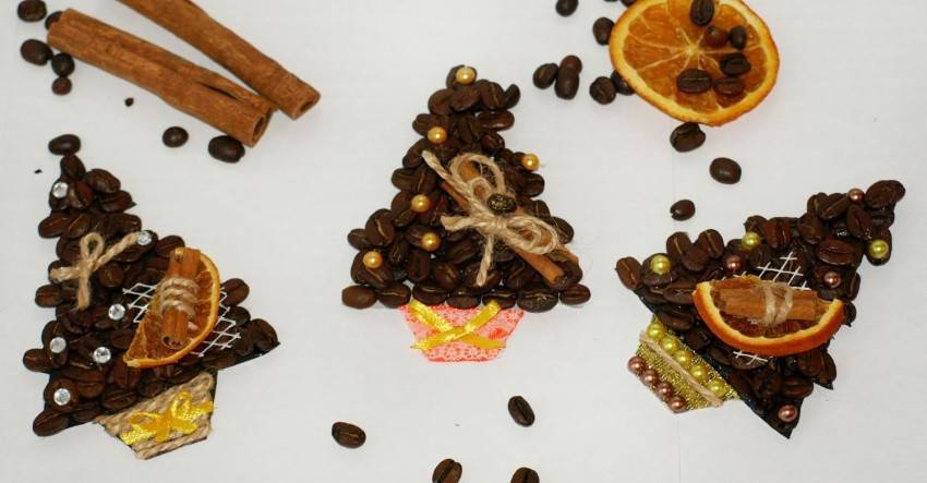 Новогодние поделки из кофейных зерен можно использовать для украшения дома к празднику. Это могут быть не только стилизованные елочки, но и оригинальные имитации шишек или колокольчиков, украшенные зернышками кофе.
