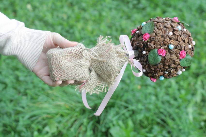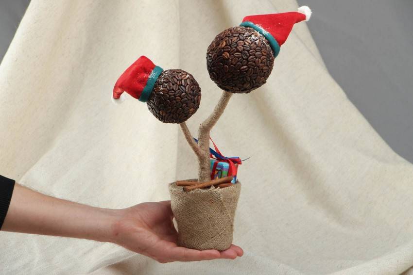 Интересная поделка кофейное дерево может иметь в качестве подставки цветочный горшок или декоративную «ножку».