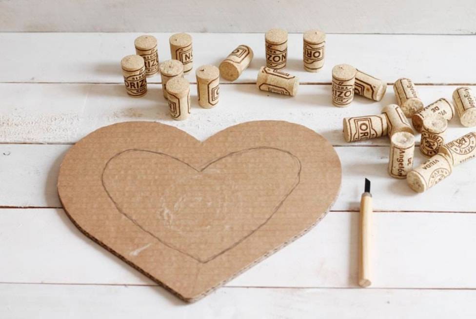 На листе картона рисуем сердце такого размера, какой должна быть в результате поделка. Внутри рисуем еще одно сердце чуть меньшего размера. Обрезаем винные пробки таким образом, чтобы они были одинаковой длины.