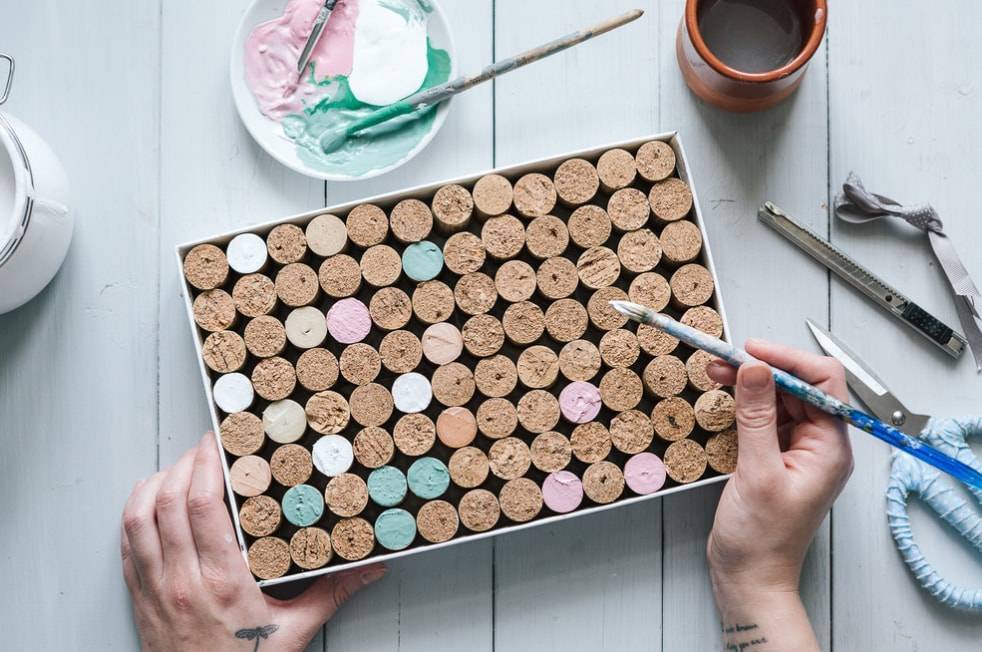После того, как вся конструкция полностью высохнет, окрашиваем некоторые пробки в разные оттенки. В данном случае используется пастельная цветовая гамма, но вы можете подобрать подходящий к вашему интерьеру вариант.