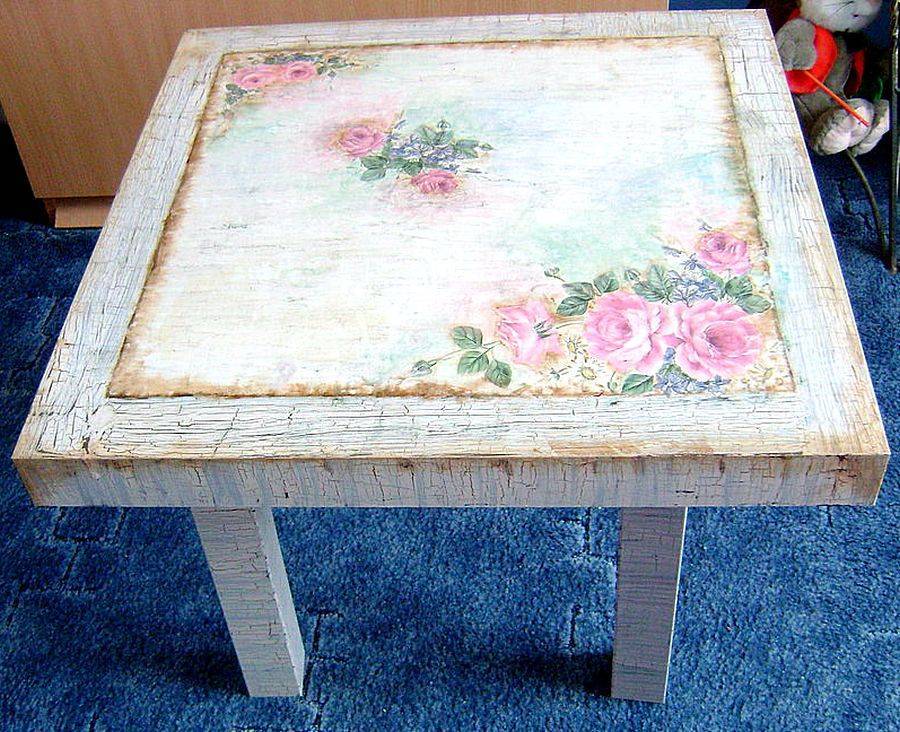 Декупаж стола с трещинами отлично подходит для стиля шебби шик, создавая эффект состаренности мебели