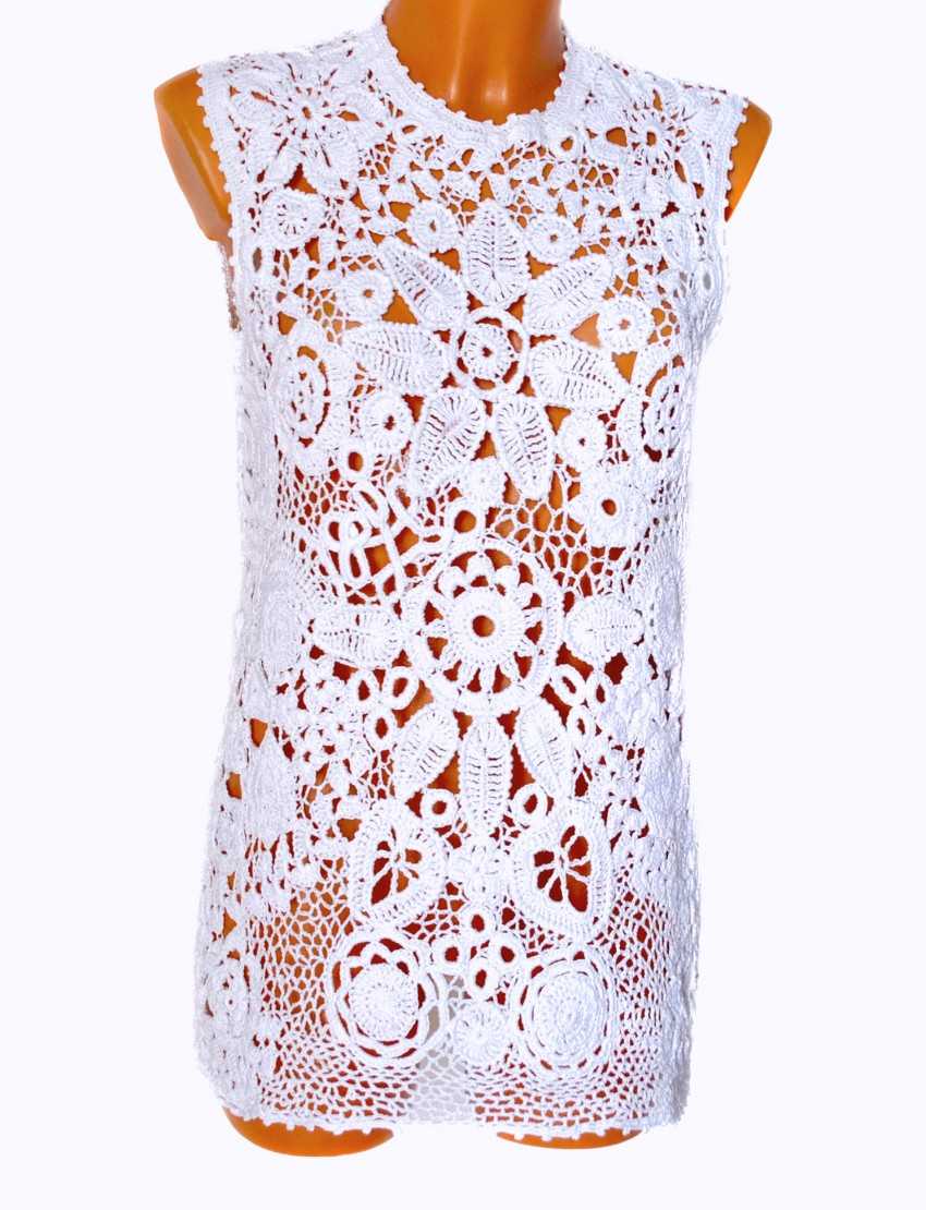 В некоторых случаях сначала вяжется само сетчатое полотно и уже на него накладываются основные элементы мотивов ирландского кружева. Допускается использование для основы обычной сетчатой тюли. Это намного проще и удобнее особенно начинающим кружевницам, которые только усваивают уроки мастерства. Модели с такими рисунками смотрятся весьма привлекательно.