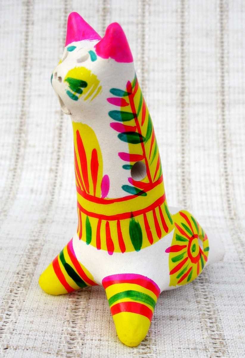 Нужно помнить, что очередной слой на свистульку наносится только после того, как полностью высох предыдущий. Обычно расписывать начинают с желтого цвета, затем делают узоры малиновым, а уже потом завершают все зеленым цветом. Часть фигурки, где человек будет прикасаться губами, должна оставаться незакрашенной. Смешивать цвета не принято. Кисточка из куриного пера обмакивается в анилиновые краски, предварительно растертые на содержимом яйца.