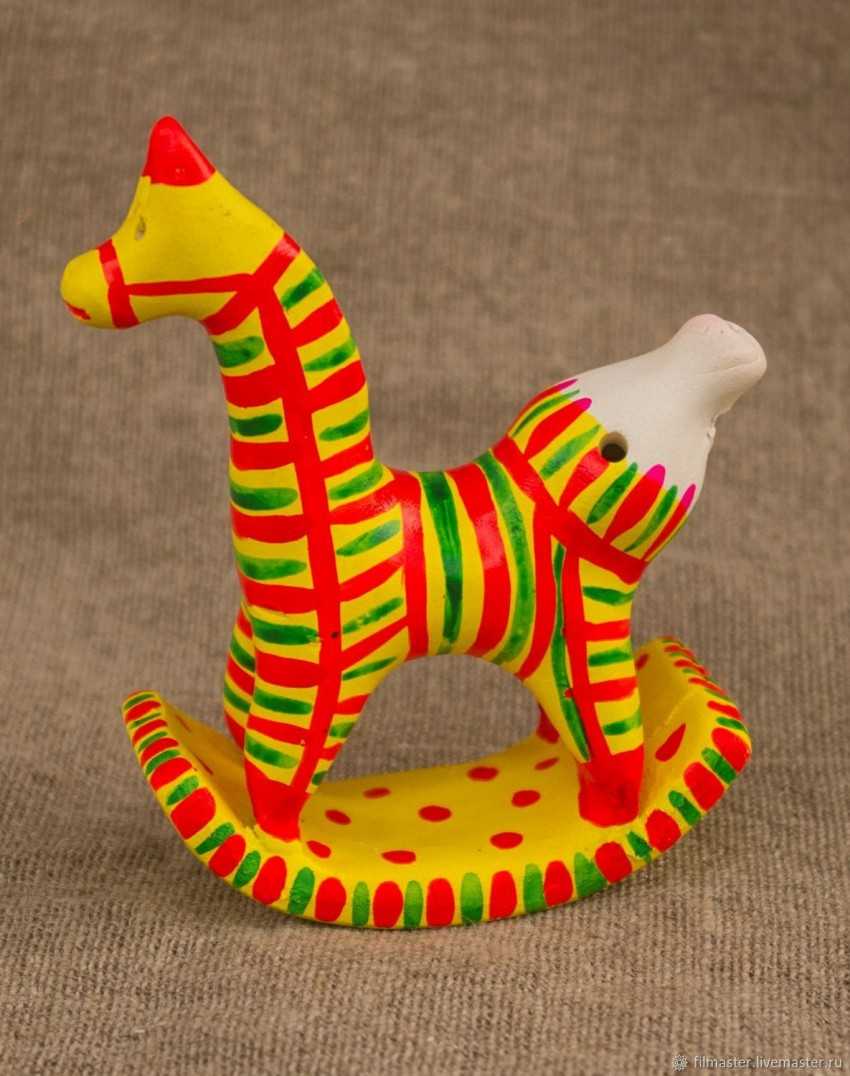 Чем характерны филимоновские игрушки? Кроме очень специфической росписи, в глаза сразу бросается их удлинённость и извилистость. Особенно это относится к шее, филимоновские звери явно произошли от жирафов или змей.