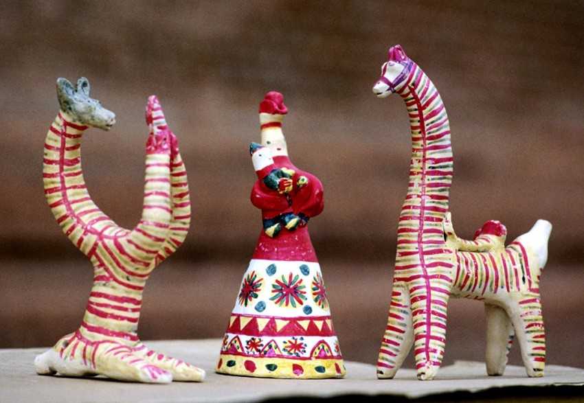 Своеобразие игрушек заключалось еще и в отсутствии большого количества деталей. Для фигурок не было каких-то специальных шаблонов — они делались так, как видел их мастер. Но при этом все животные имеют стандартно вытянутое туловище. Порой отличить лошадь от барана или быка помогают лишь рога соответствующей формы.